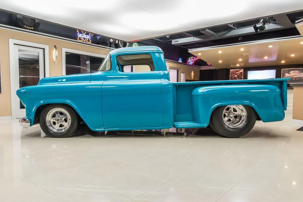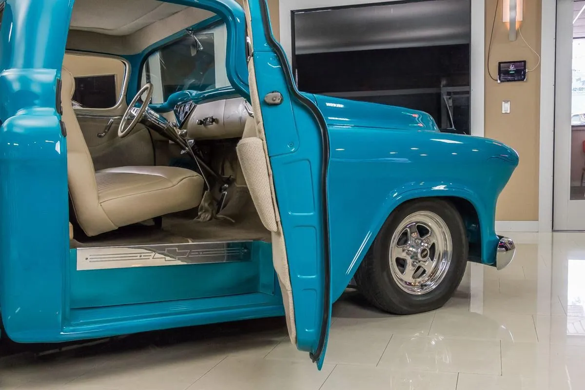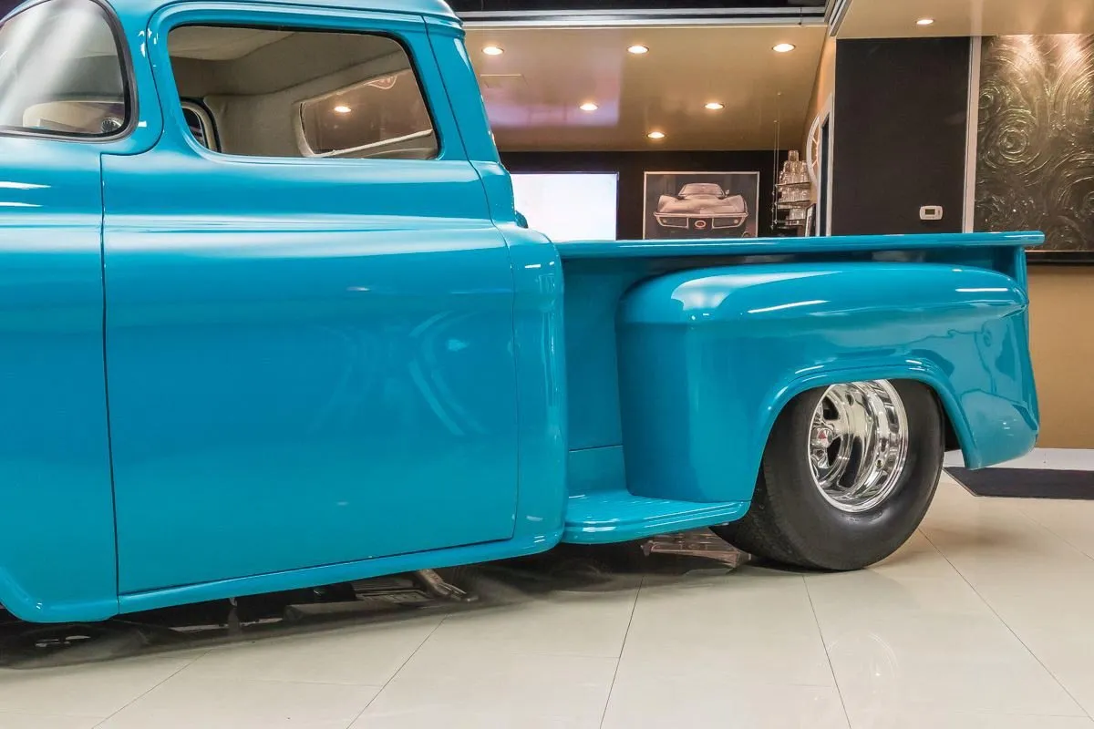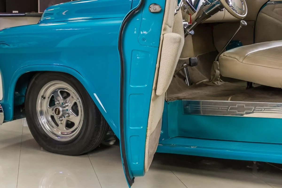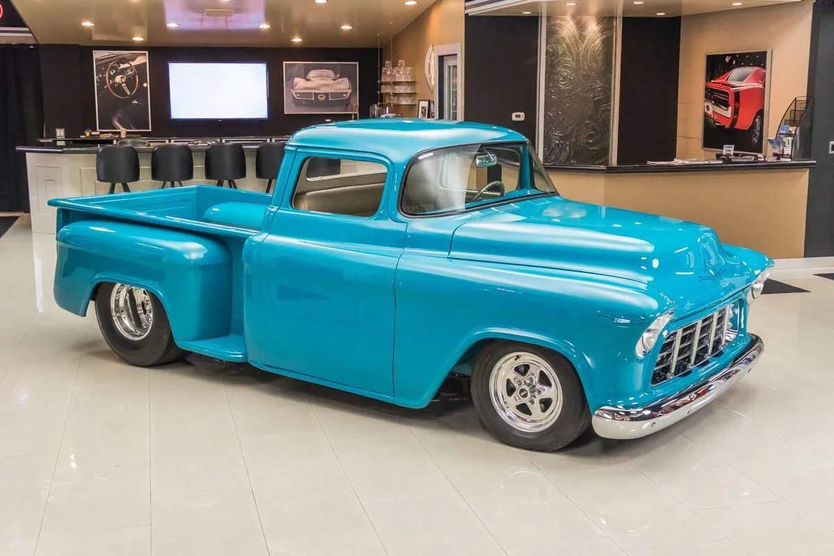 1955 Chevrolet 3100 Pickup in Custom Two-Tone over Tan Upholstered Interior. This fully restored, all-steel custom 3100 underwent a high-end frame-off build with a focus on power, detail, and presentation. It’s powered by a true GM 427ci V8 featuring LS5 heads, 750 Holley carburetor, and a TH350 automatic transmission. A 9” Ford rear end with 3.25:1 gears delivers strong street performance, complemented by power 4-wheel disc brakes and power steering.