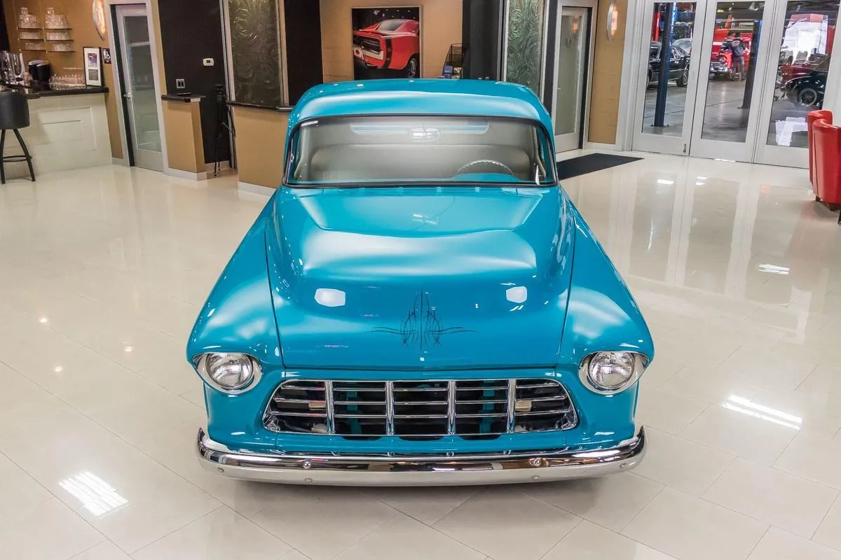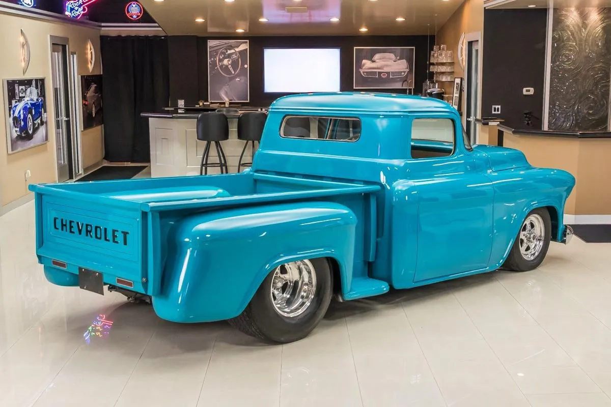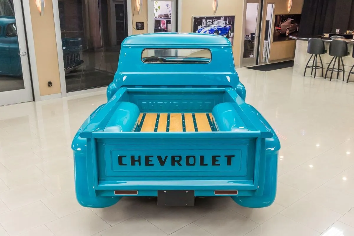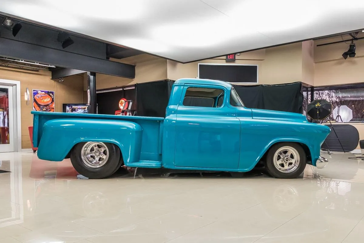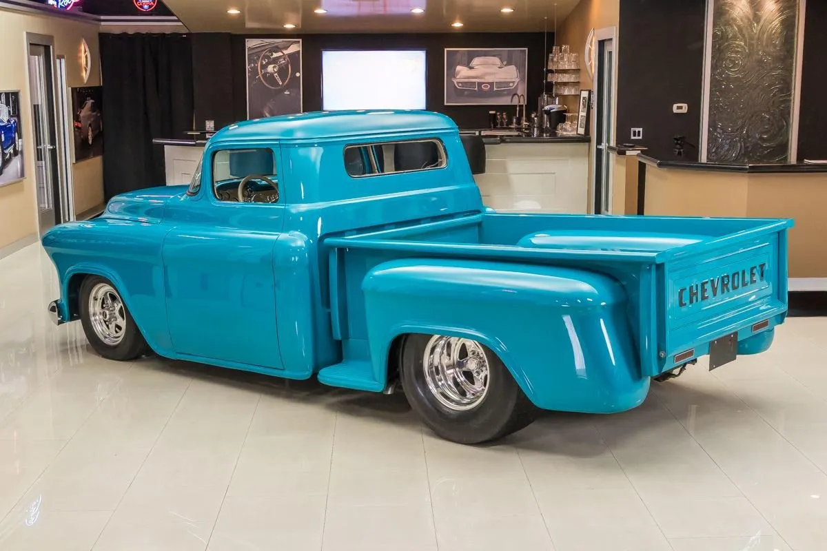 1955 Chevrolet 3100 Pickup in Custom Two-Tone over Tan Upholstered Interior. This fully restored, all-steel custom 3100 underwent a high-end frame-off build with a focus on power, detail, and presentation. It’s powered by a true GM 427ci V8 featuring LS5 heads, 750 Holley carburetor, and a TH350 automatic transmission. A 9” Ford rear end with 3.25:1 gears delivers strong street performance, complemented by power 4-wheel disc brakes and power steering.