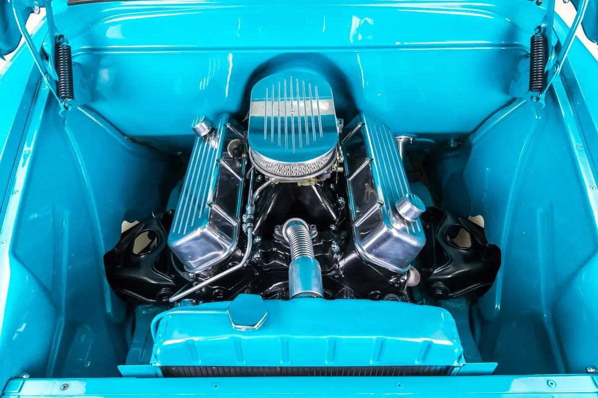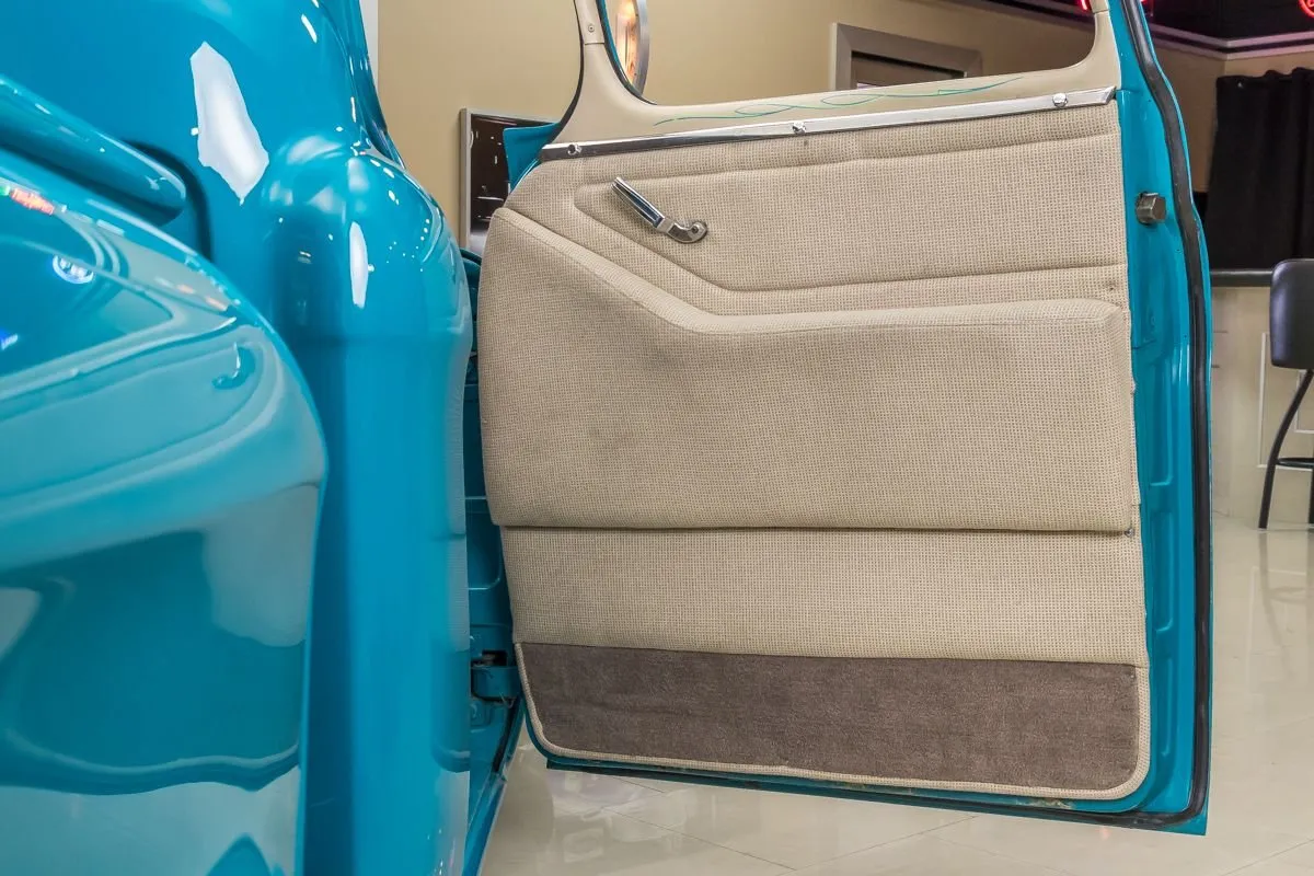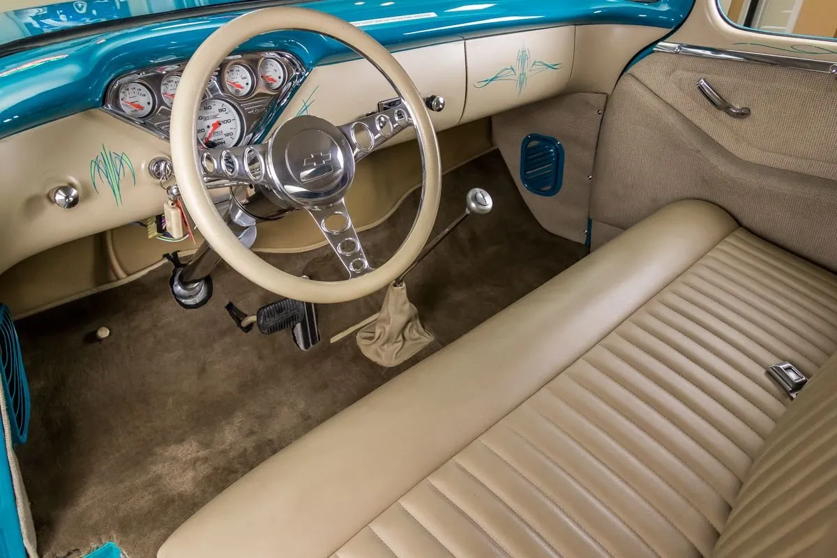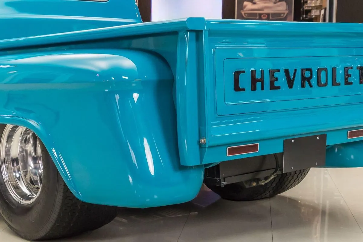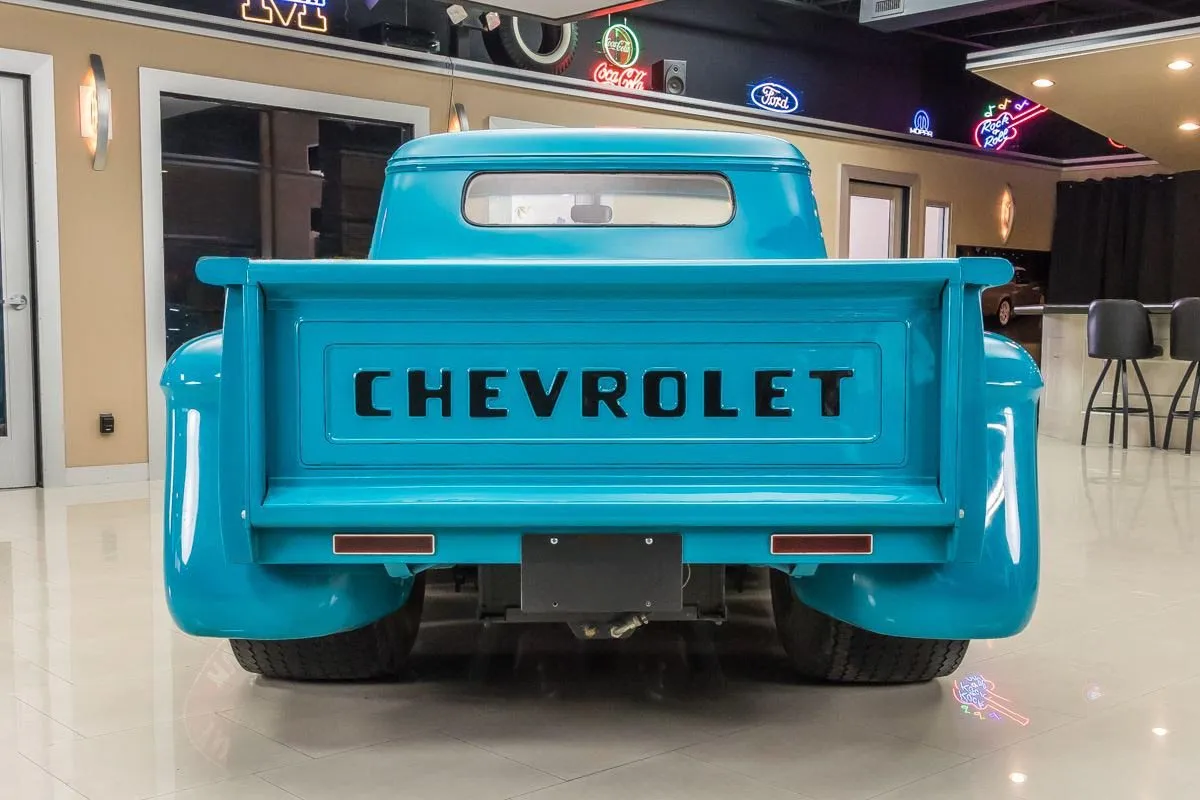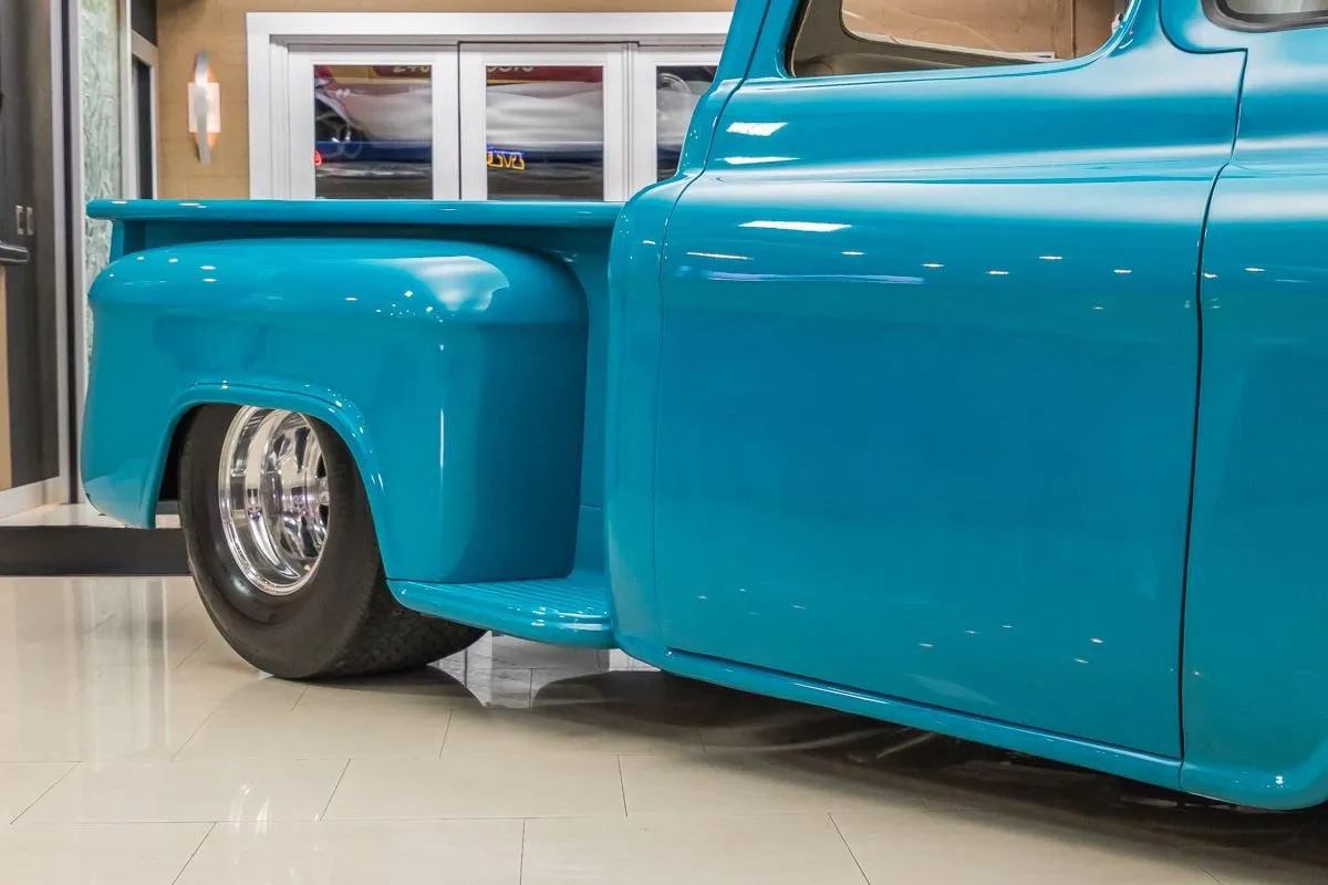 1955 Chevrolet 3100 Pickup in Custom Two-Tone over Tan Upholstered Interior. This fully restored, all-steel custom 3100 underwent a high-end frame-off build with a focus on power, detail, and presentation. It’s powered by a true GM 427ci V8 featuring LS5 heads, 750 Holley carburetor, and a TH350 automatic transmission. A 9” Ford rear end with 3.25:1 gears delivers strong street performance, complemented by power 4-wheel disc brakes and power steering.