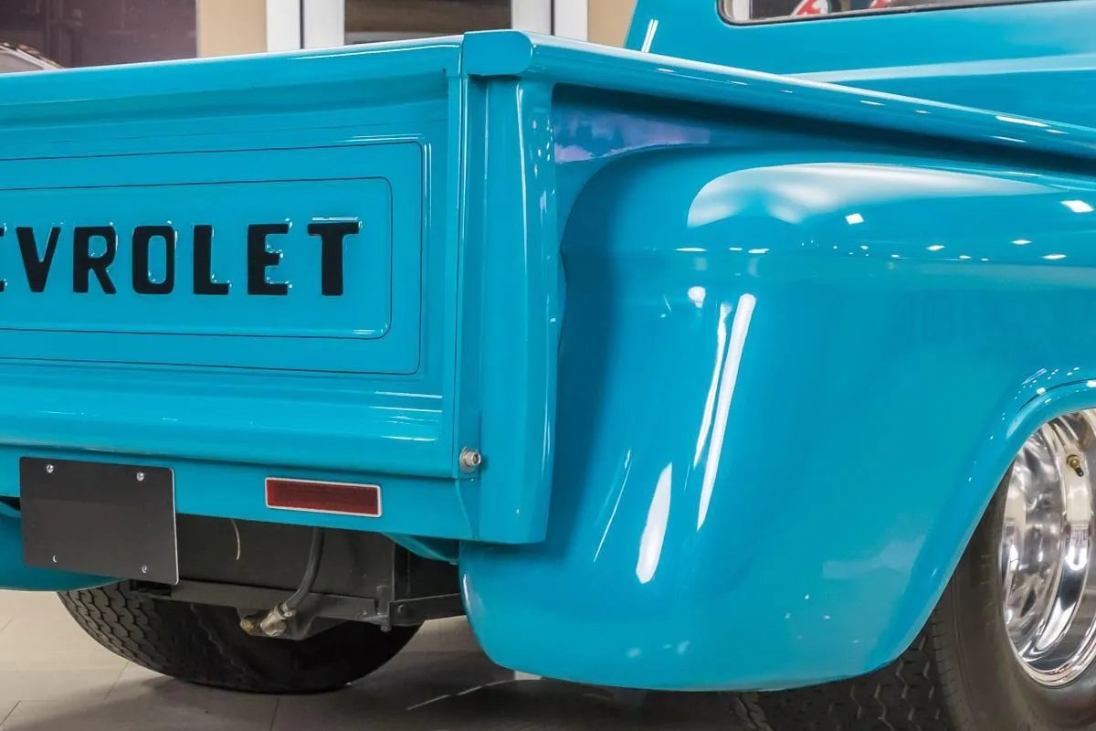 Inside, the truck features a tan bench seat, custom door panels, headliner, and pinstriped dash. A modern gauge cluster, Lokar shifter, power windows, and a Flaming River steering column complete the custom interior. With its blend of vintage steel and high-performance upgrades, this 3100 is an impressive show-quality build ready to turn heads.