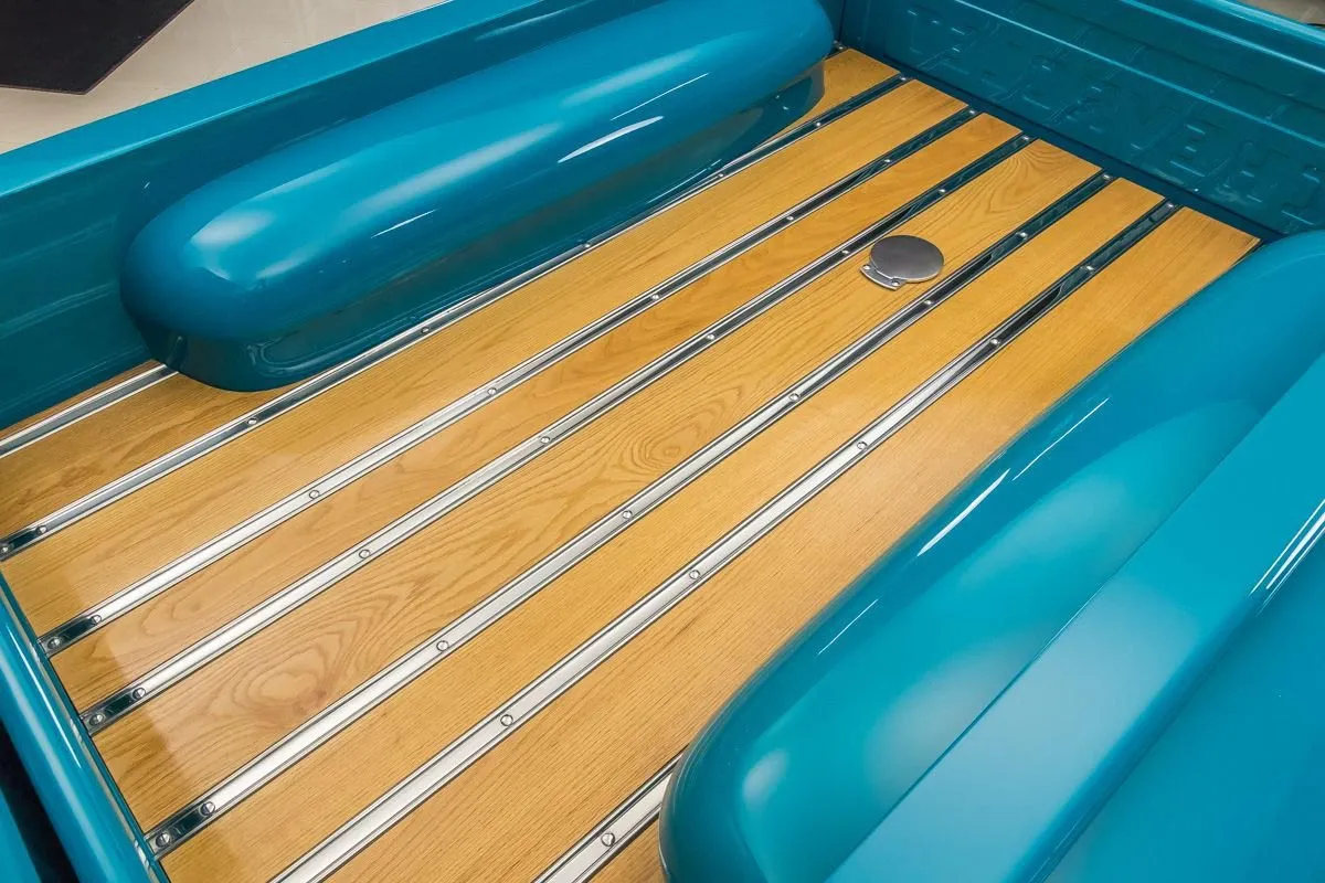The exterior showcases shaved door handles with hidden poppers, custom pin striping, a chopped and channeled body, and a wood-finished bed. Chrome bumpers, grill, and Weld wheels (15″ front, wide 31×18.5″ rear) enhance its aggressive stance. The body-color painted frame and smoothed firewall speak to the build quality, while the undercarriage is clean and highly detailed.