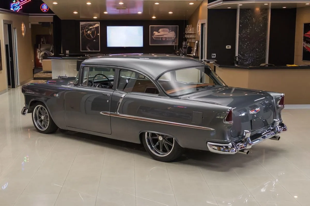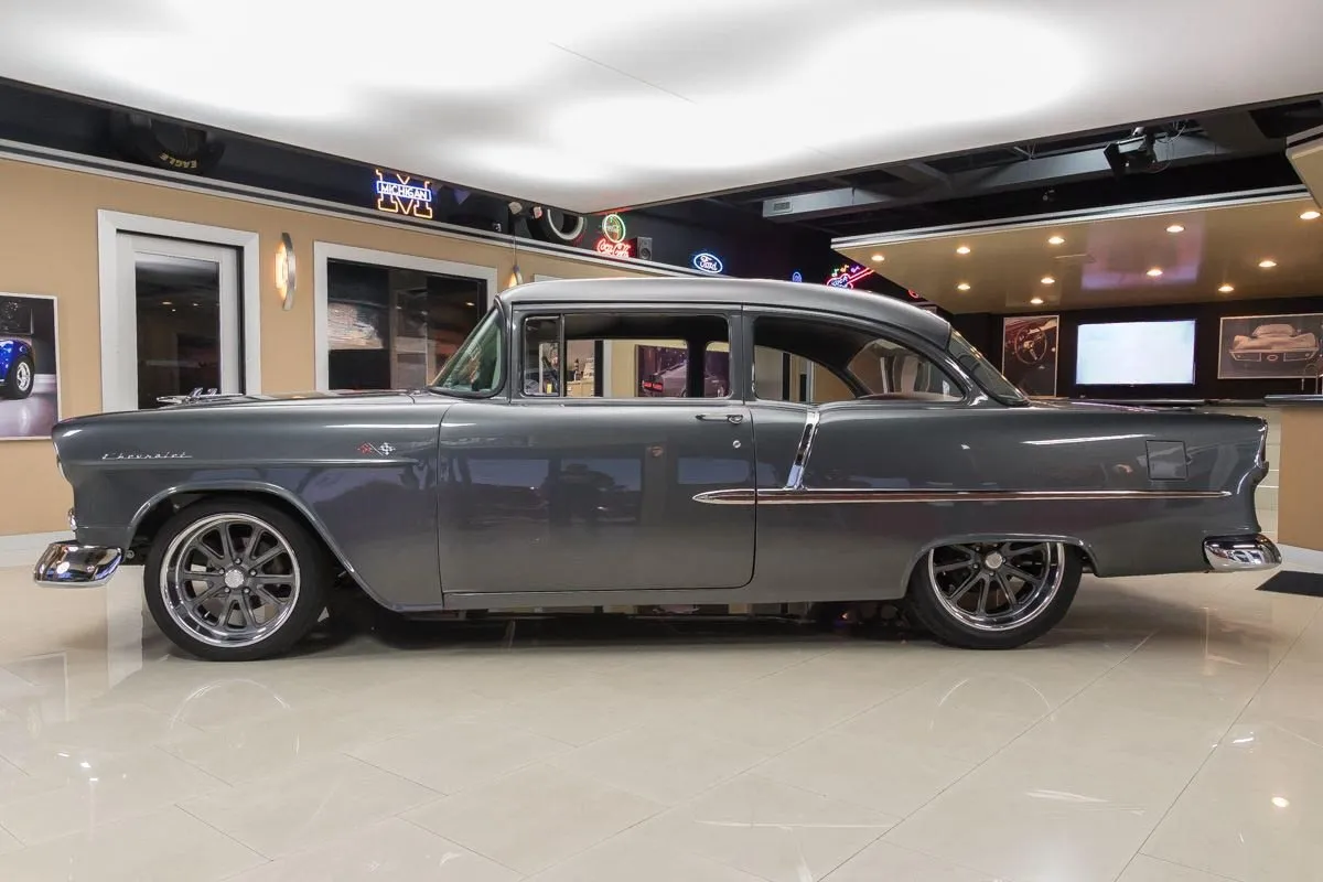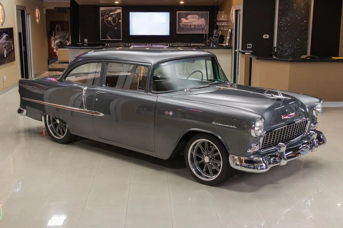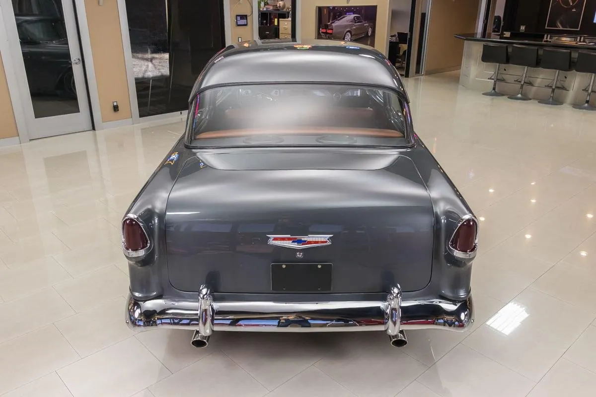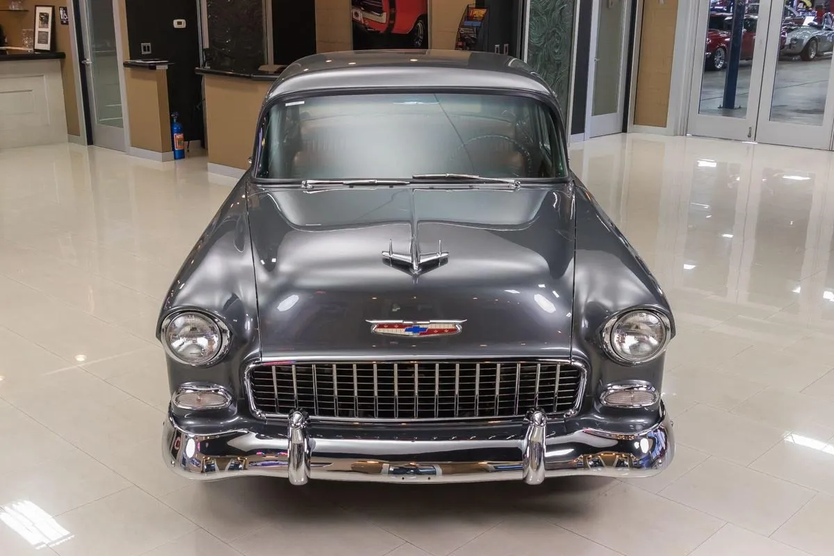 1955 Chevrolet Bel Air in Graphite Gray over Brick-Colored Leather Interior. This stunning Bel Air received a full frame-off, rotisserie nut-and-bolt restoration and has just 500 miles since completion. Power comes from a Chevrolet 350ci V8 paired with a Saginaw 4-speed manual transmission, delivering smooth performance through a 3.70:1 rear axle. A Holley 4-barrel carburetor and polished aluminum intake enhance both performance and presentation.