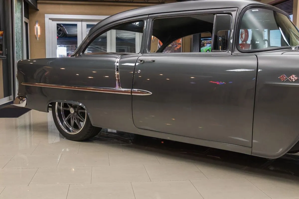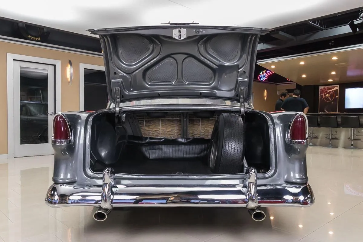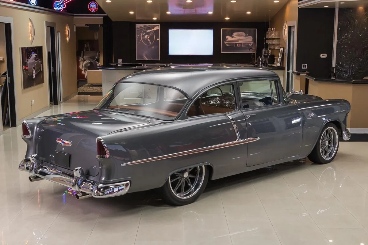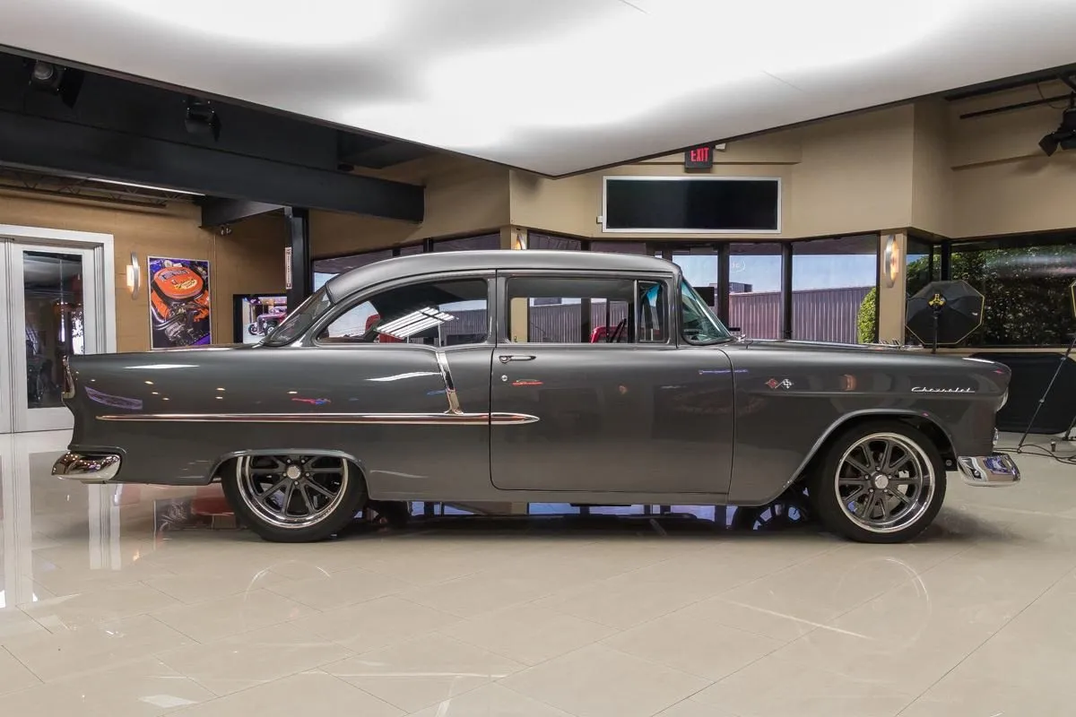 1955 Chevrolet Bel Air in Graphite Gray over Brick-Colored Leather Interior. This stunning Bel Air received a full frame-off, rotisserie nut-and-bolt restoration and has just 500 miles since completion. Power comes from a Chevrolet 350ci V8 paired with a Saginaw 4-speed manual transmission, delivering smooth performance through a 3.70:1 rear axle. A Holley 4-barrel carburetor and polished aluminum intake enhance both performance and presentation.