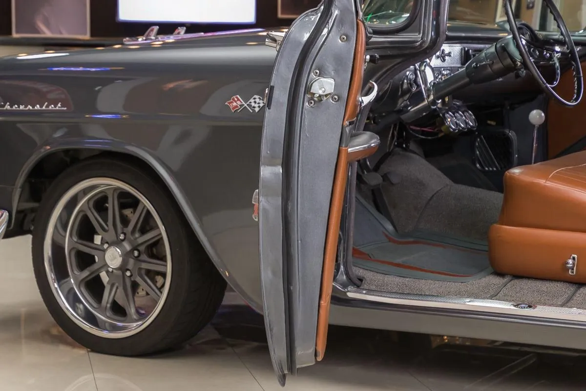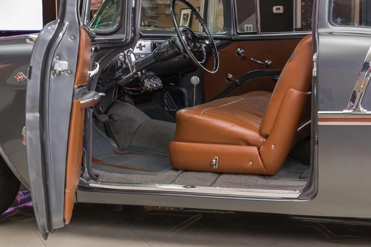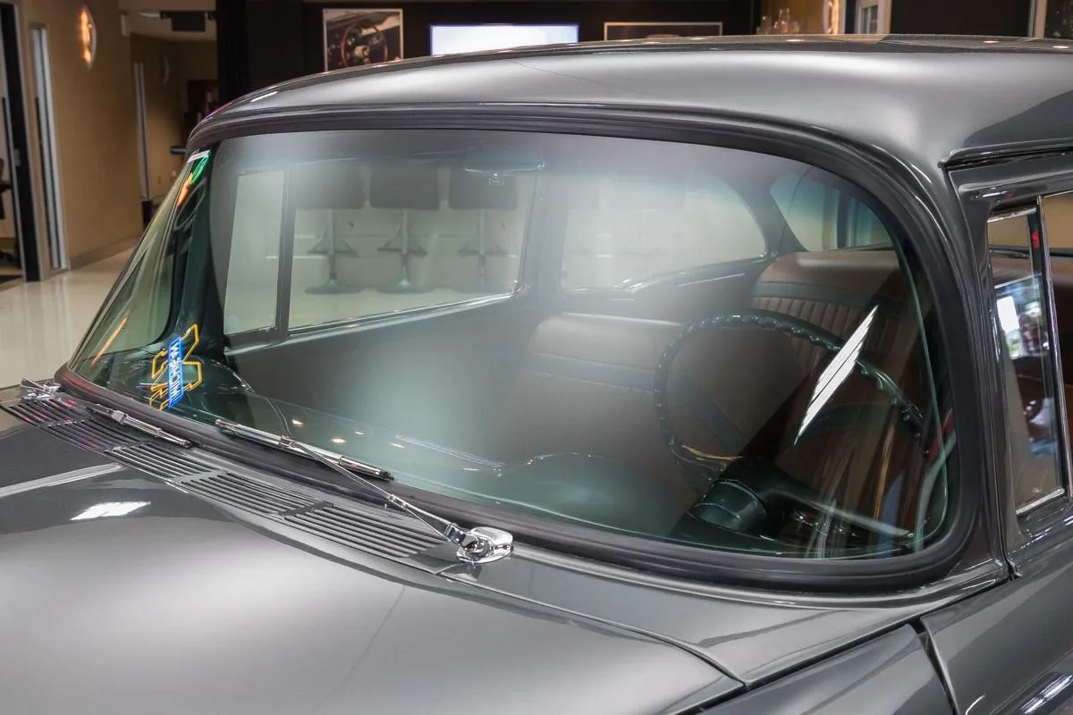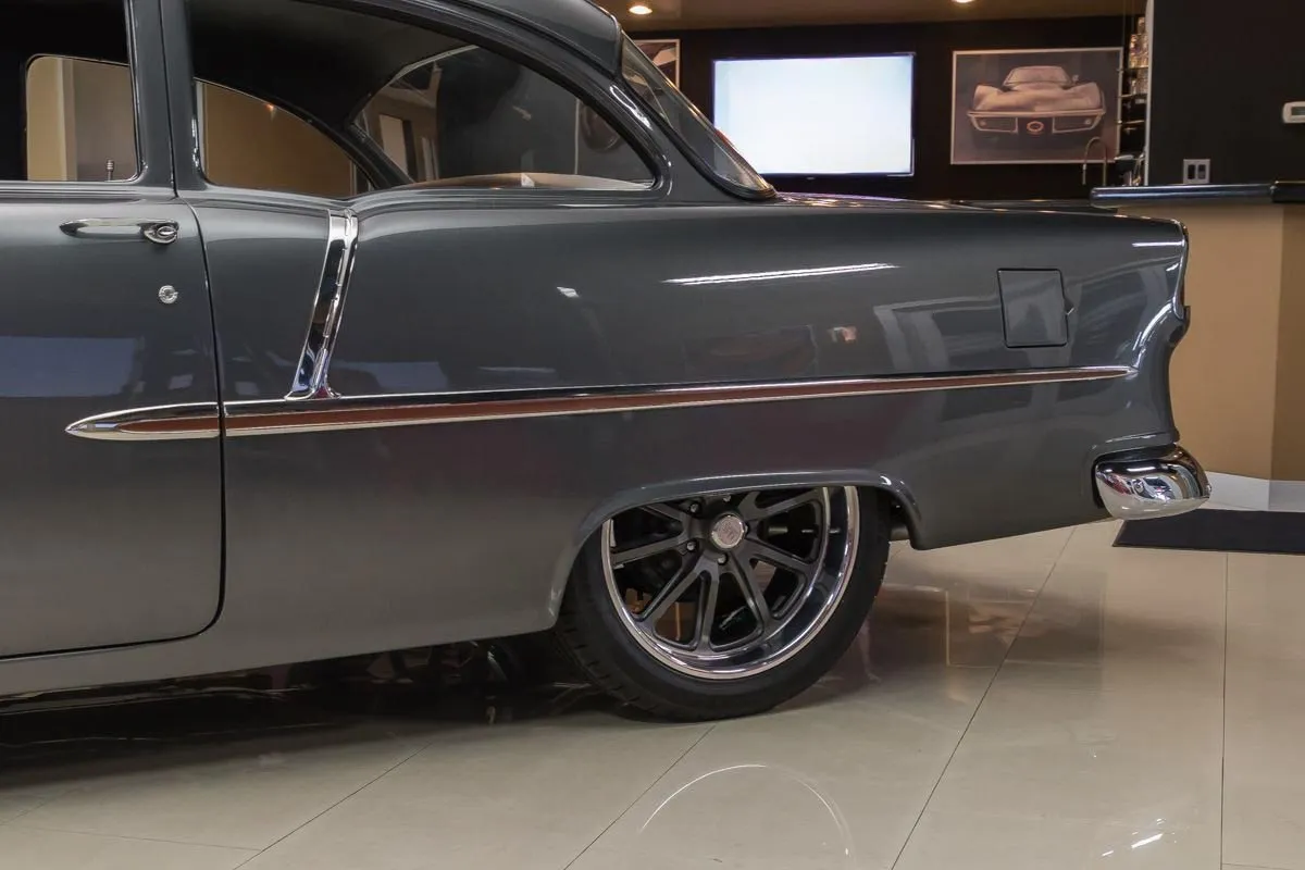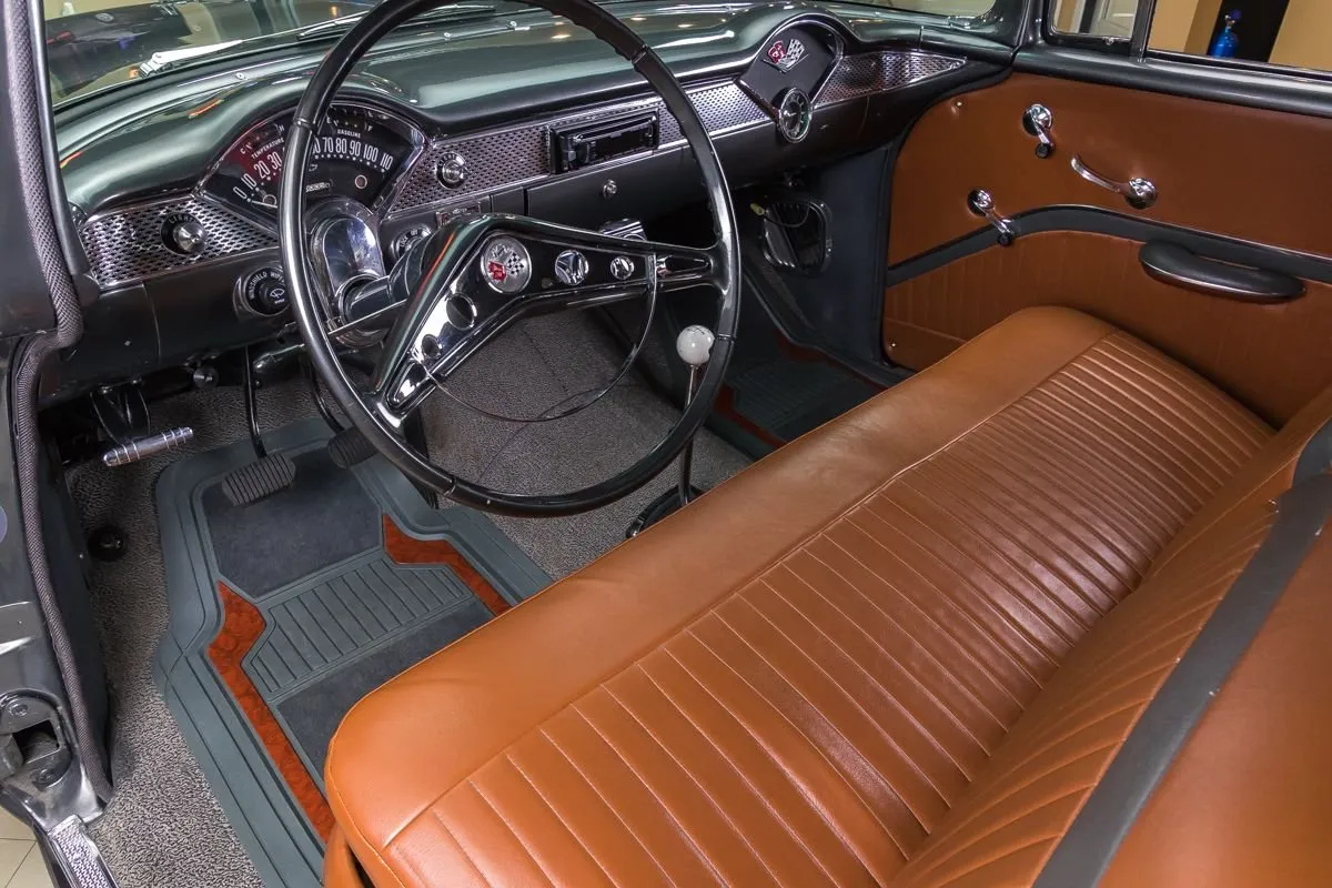 1955 Chevrolet Bel Air in Graphite Gray over Brick-Colored Leather Interior. This stunning Bel Air received a full frame-off, rotisserie nut-and-bolt restoration and has just 500 miles since completion. Power comes from a Chevrolet 350ci V8 paired with a Saginaw 4-speed manual transmission, delivering smooth performance through a 3.70:1 rear axle. A Holley 4-barrel carburetor and polished aluminum intake enhance both performance and presentation.
