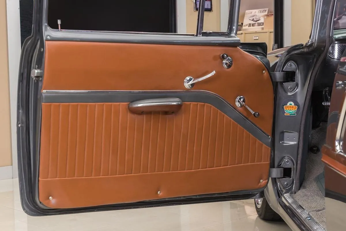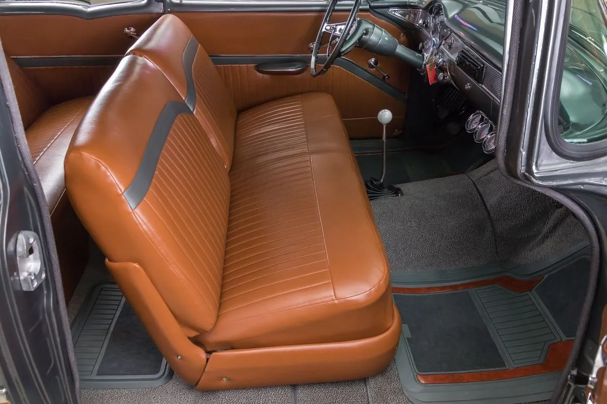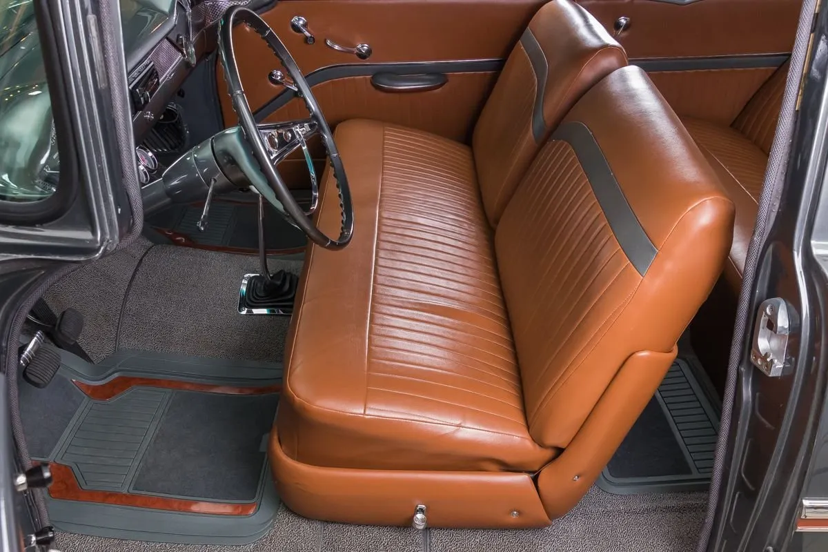 Outside, the body is laser-straight with deep Graphite Gray paint, new chrome, and bright moldings. Details like the airplane hood ornament and US Mags (18” front, 20” rear) complete the vintage-meets-modern look. Inside, the cabin features a beautiful bench seat, tight headliner, 4-speed shifter, custom dash pad, and functional dome lighting.