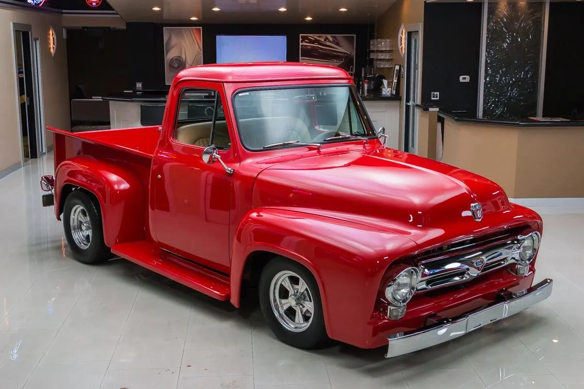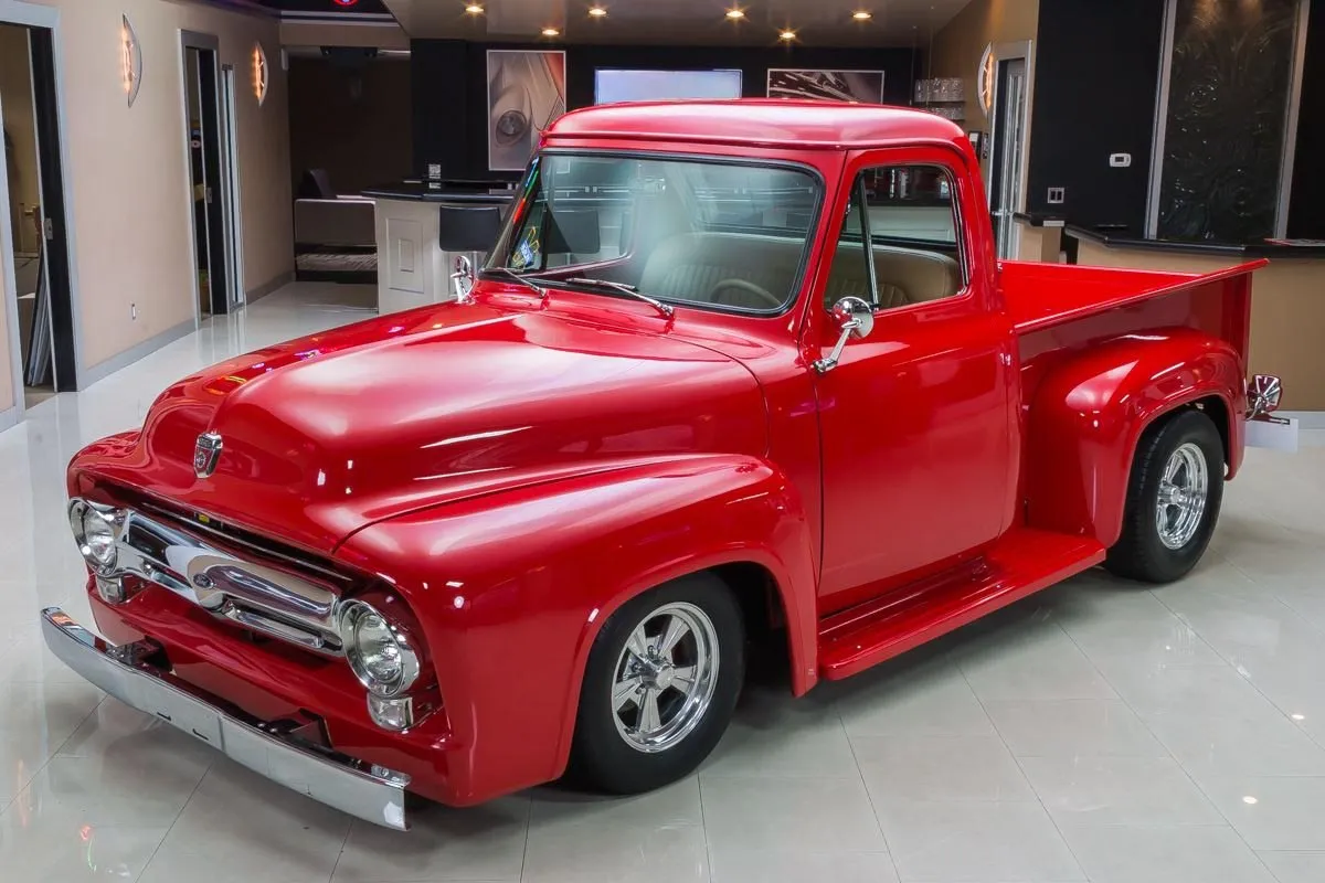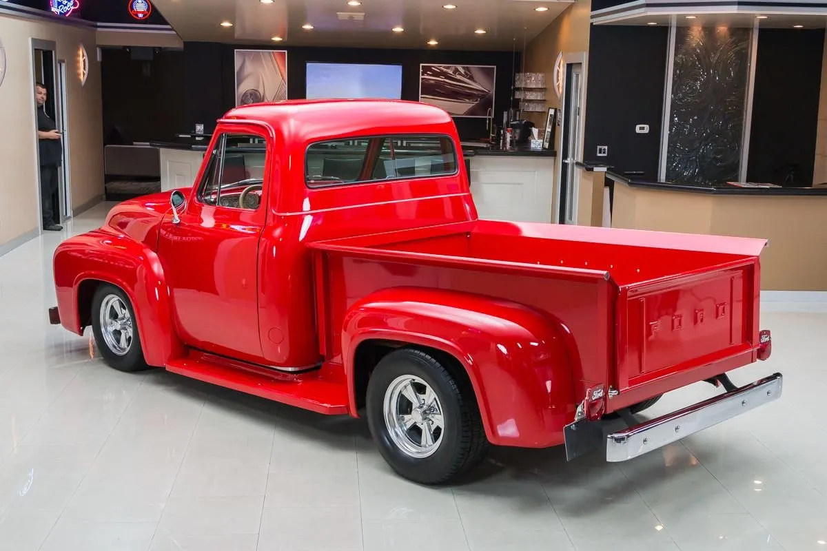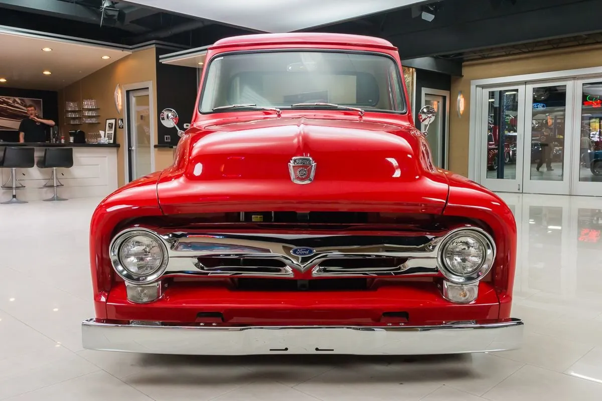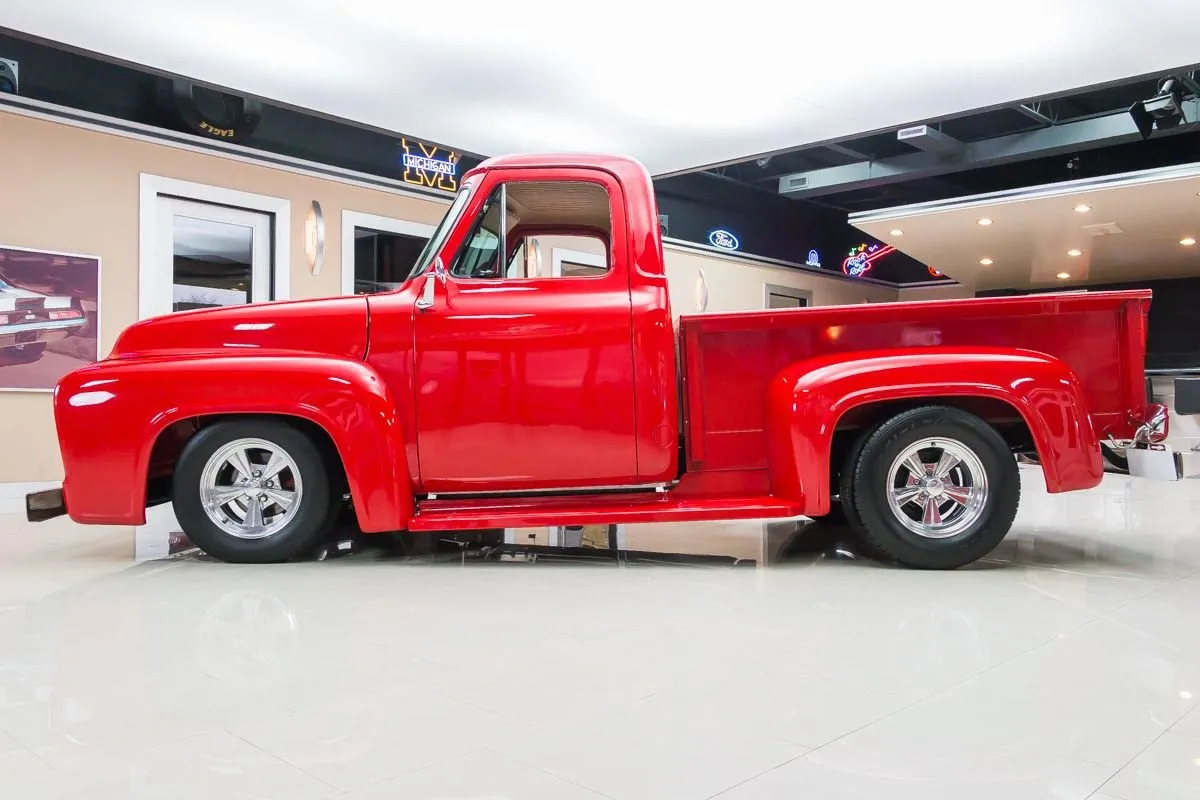 1955 Ford F100 Pickup in Bright Red over Custom Interior. This all-steel F100 underwent a full frame-off restoration with a complete Ford drivetrain. Power comes from a Ford 302ci V8 mated to a smooth C4 automatic transmission and a Ford 9-inch rear end with 3.23:1 gearing. Performance upgrades include an Edelbrock intake and carburetor, jet-coated headers, power steering, power brakes, and air conditioning.