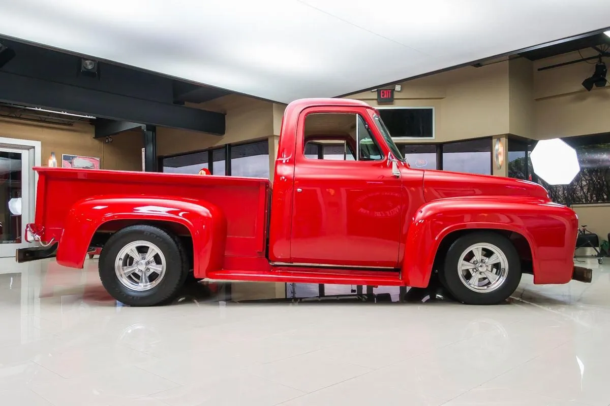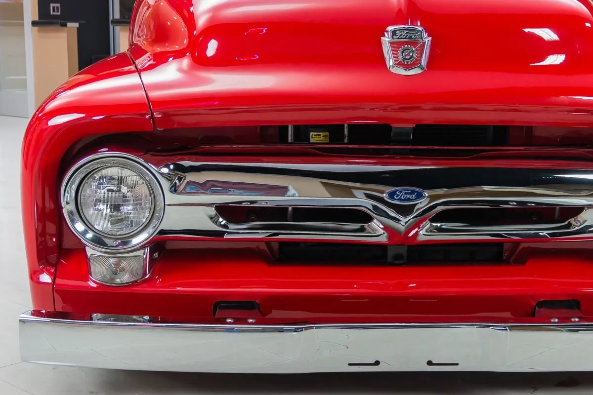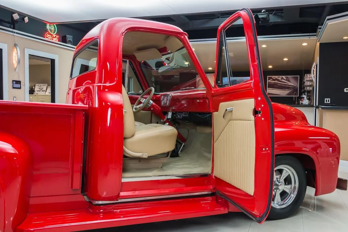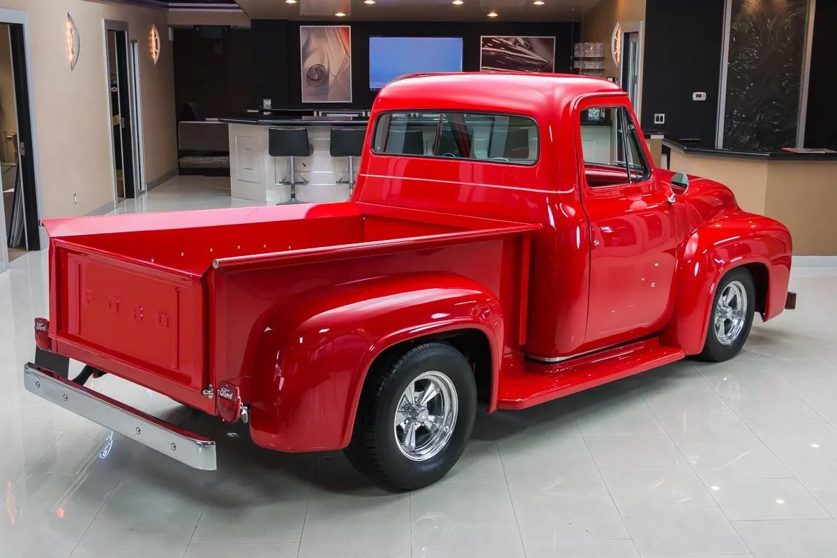 1955 Ford F100 Pickup in Bright Red over Custom Interior. This all-steel F100 underwent a full frame-off restoration with a complete Ford drivetrain. Power comes from a Ford 302ci V8 mated to a smooth C4 automatic transmission and a Ford 9-inch rear end with 3.23:1 gearing. Performance upgrades include an Edelbrock intake and carburetor, jet-coated headers, power steering, power brakes, and air conditioning.