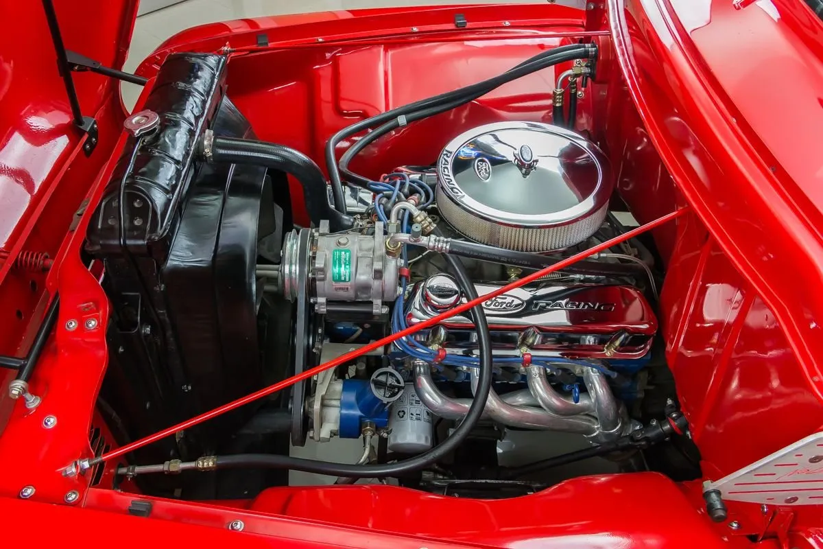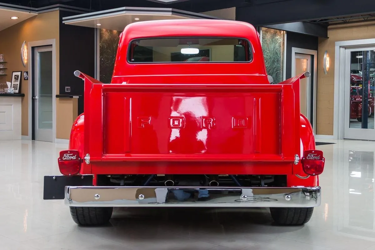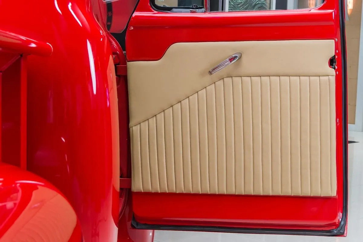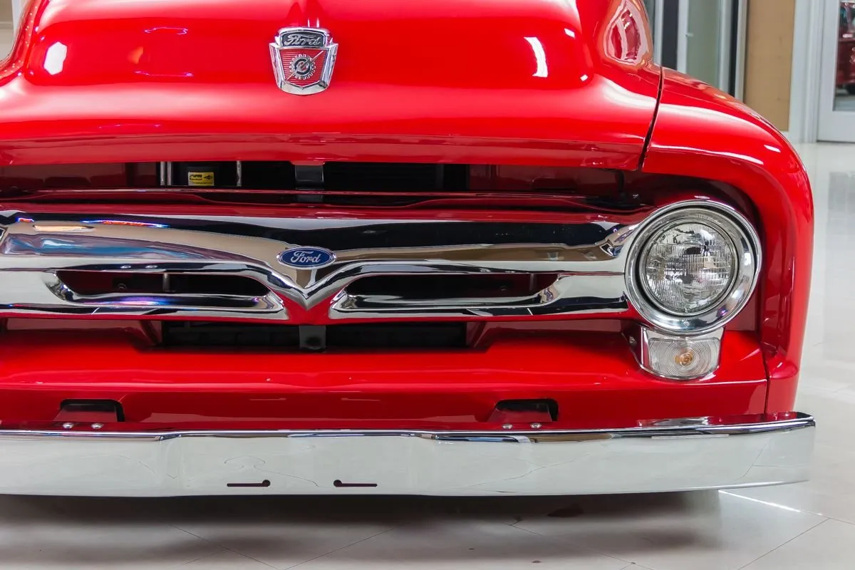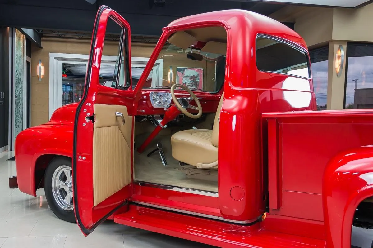 1955 Ford F100 Pickup in Bright Red over Custom Interior. This all-steel F100 underwent a full frame-off restoration with a complete Ford drivetrain. Power comes from a Ford 302ci V8 mated to a smooth C4 automatic transmission and a Ford 9-inch rear end with 3.23:1 gearing. Performance upgrades include an Edelbrock intake and carburetor, jet-coated headers, power steering, power brakes, and air conditioning.