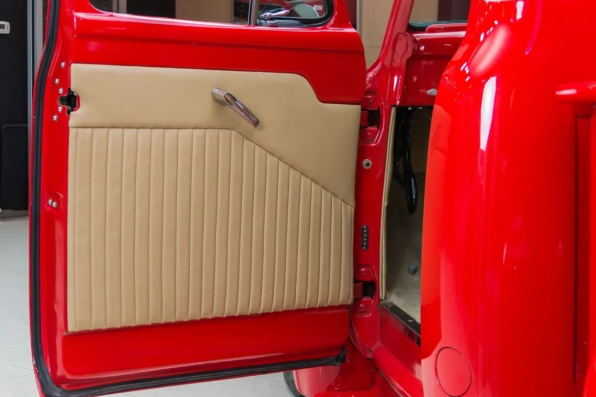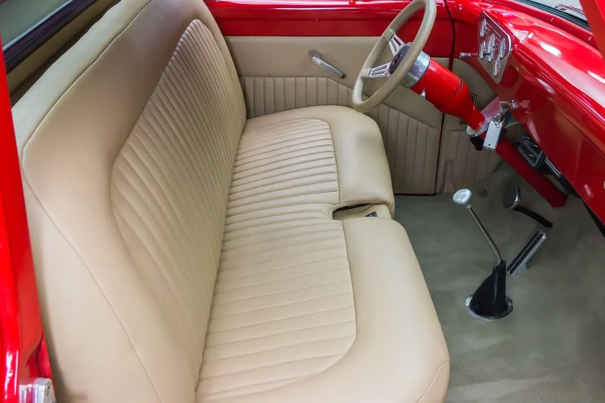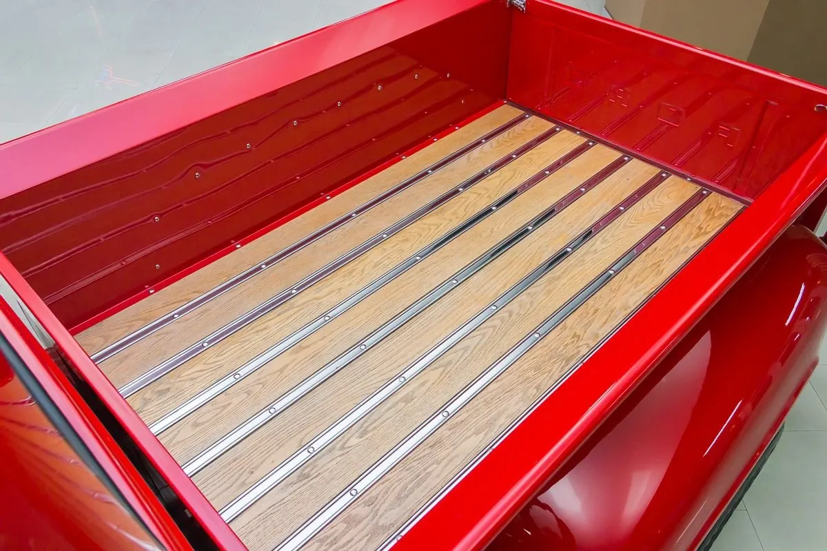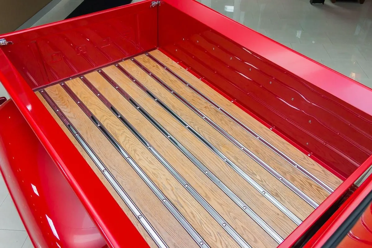 The body is finished in high-gloss Red with straight steel panels, excellent door gaps, and clean jams. Chrome and stainless trim are in outstanding condition. The oak wood bed is beautifully finished, and the painted frame shows the care taken during the restoration. It rides on polished Rocket wheels with BFGoodrich tires (245/60R15 front, 275/60R15 rear).