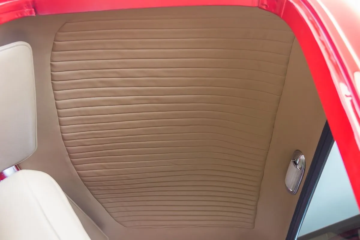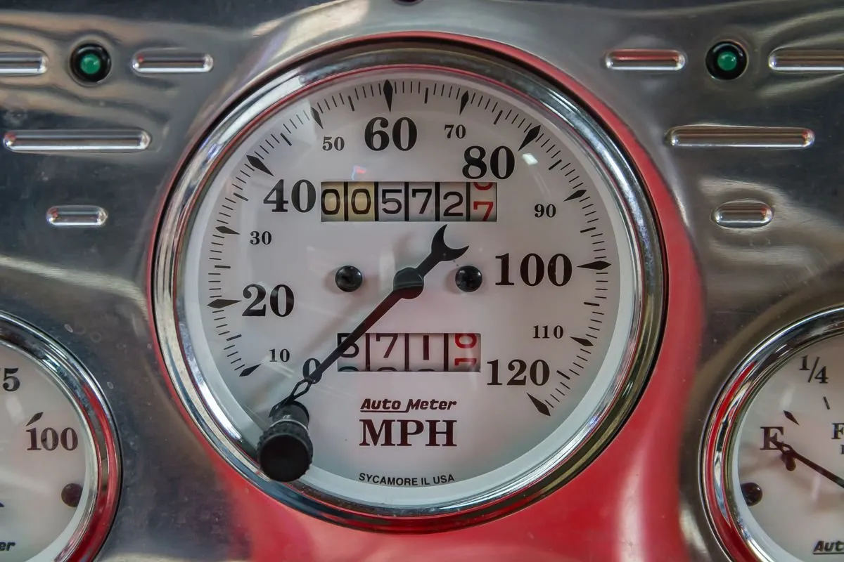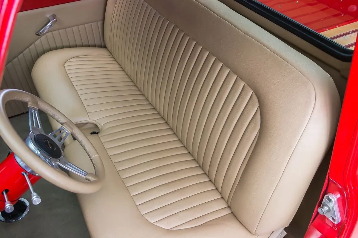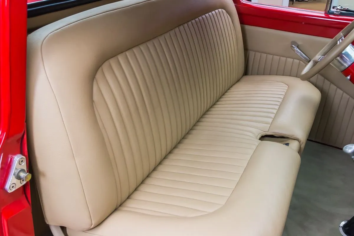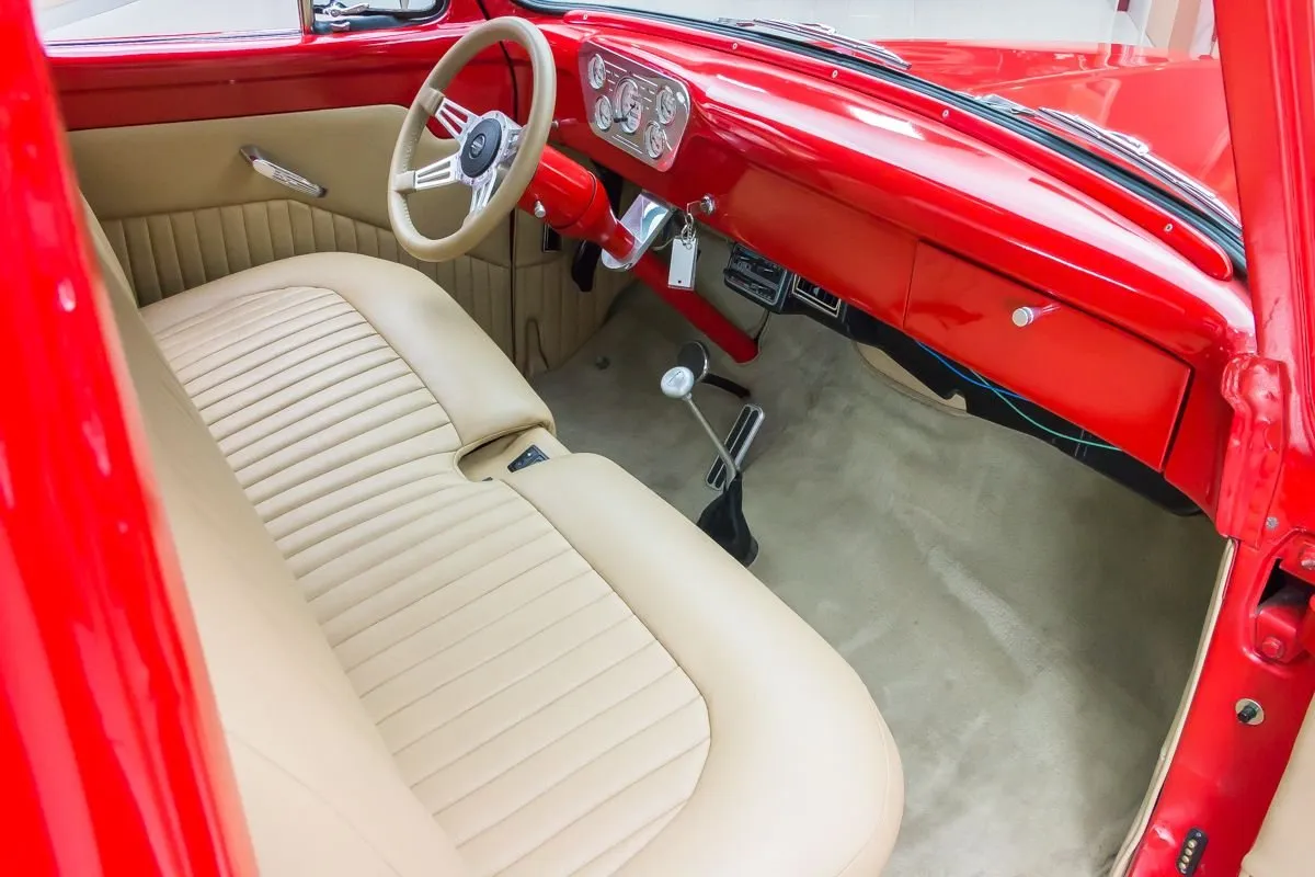 The body is finished in high-gloss Red with straight steel panels, excellent door gaps, and clean jams. Chrome and stainless trim are in outstanding condition. The oak wood bed is beautifully finished, and the painted frame shows the care taken during the restoration. It rides on polished Rocket wheels with BFGoodrich tires (245/60R15 front, 275/60R15 rear).