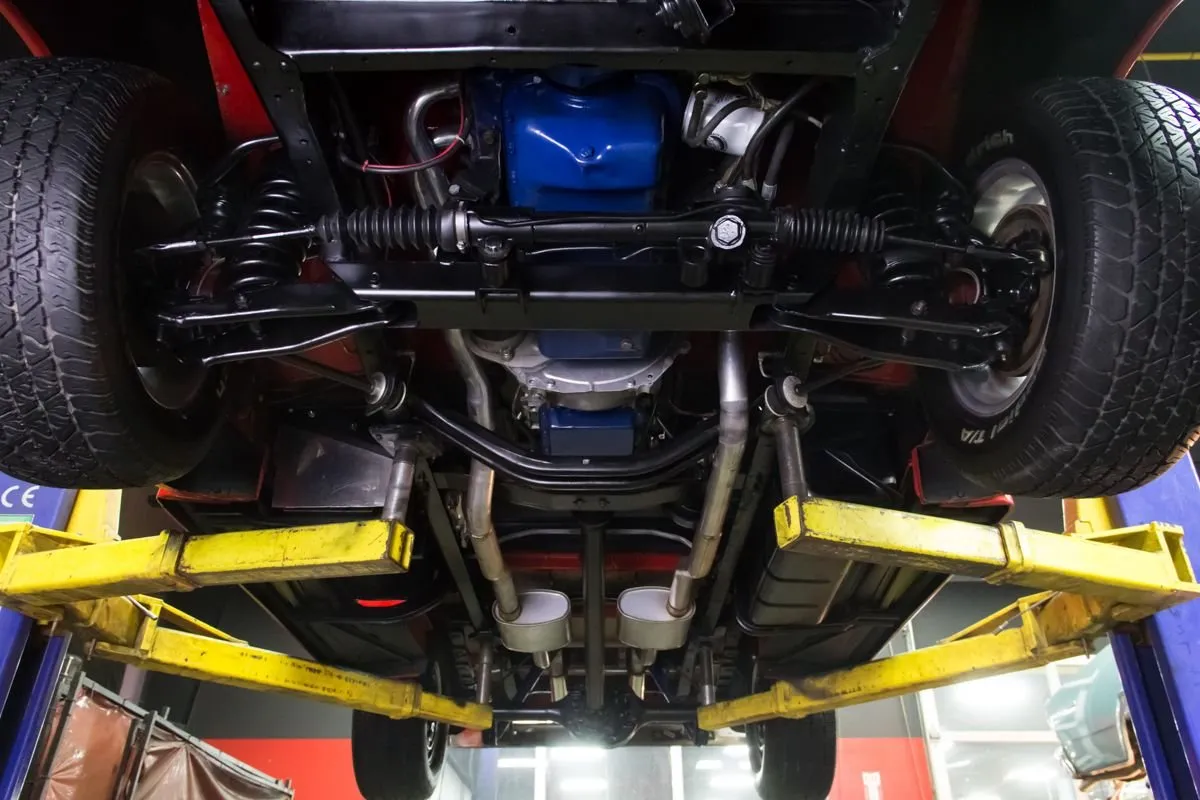 The Mustang II front suspension and rebuilt spring packs deliver modern drivability, while the exhaust system features stainless tips and brand-new mufflers. Braking is handled by front power discs and rear drums with new lines throughout.