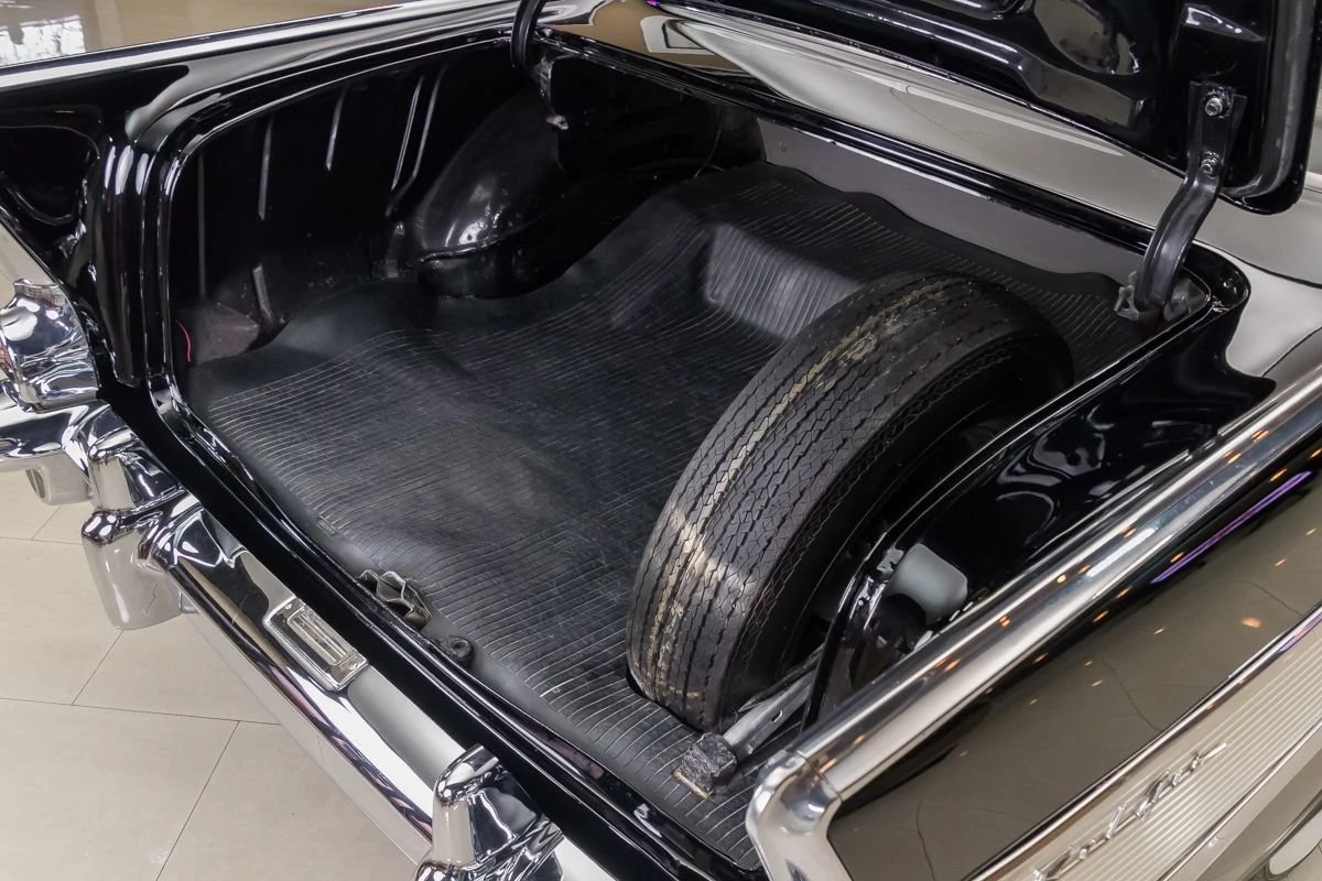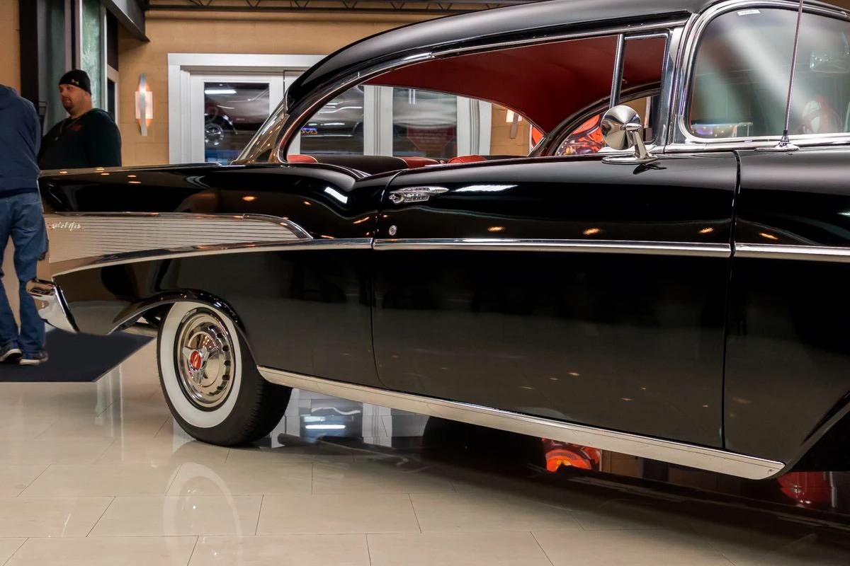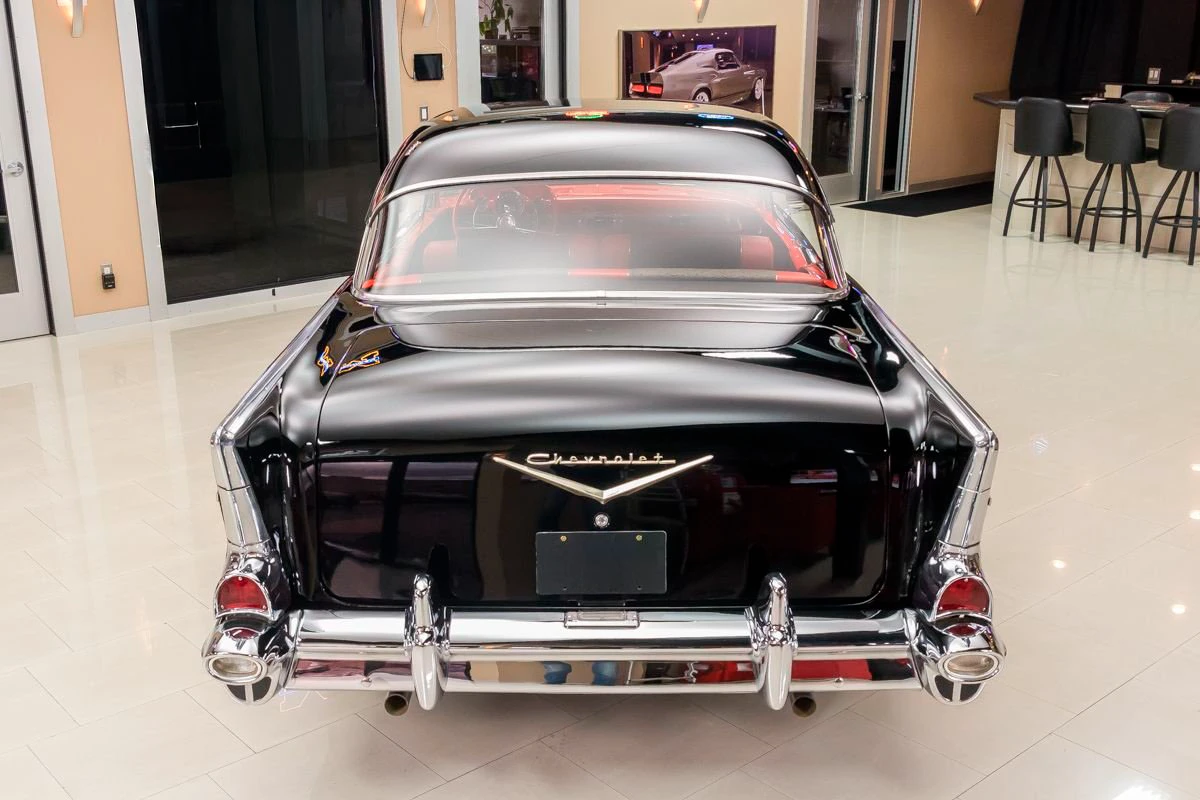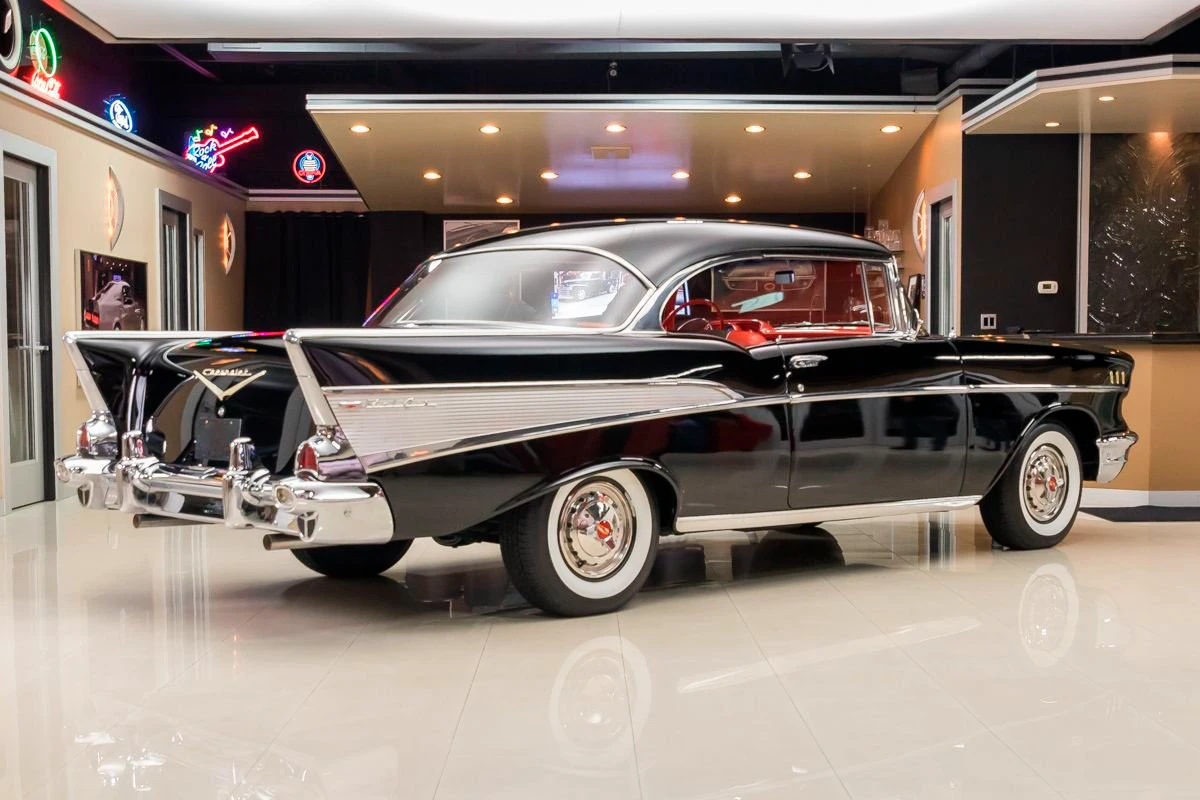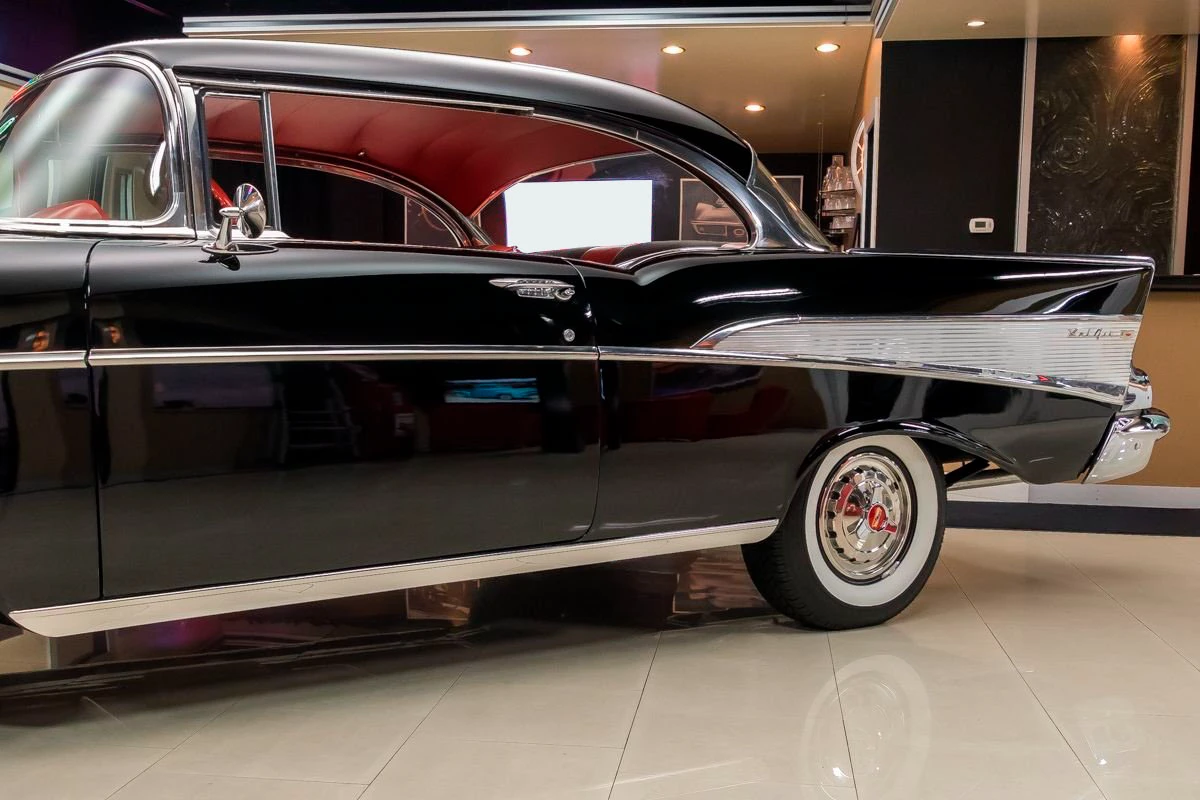 1957 Chevrolet Bel Air Hardtop in Onyx Black over Two-Tone Interior. Power comes from a 327ci V8 engine paired with a 3-speed Saginaw manual transmission, commonly known as “three-on-the-tree.” The car has undergone a complete restoration, featuring straight body lines, mirror-finish chrome, and excellent stainless trim throughout. Dual exhaust with FlowMaster mufflers adds a deep tone, while the undercarriage presents solid floors, new shocks, and a clean frame.