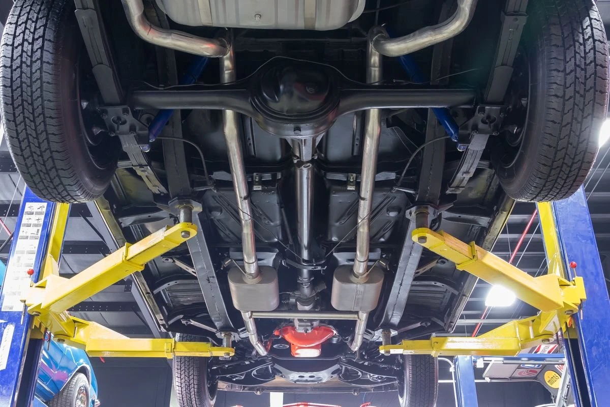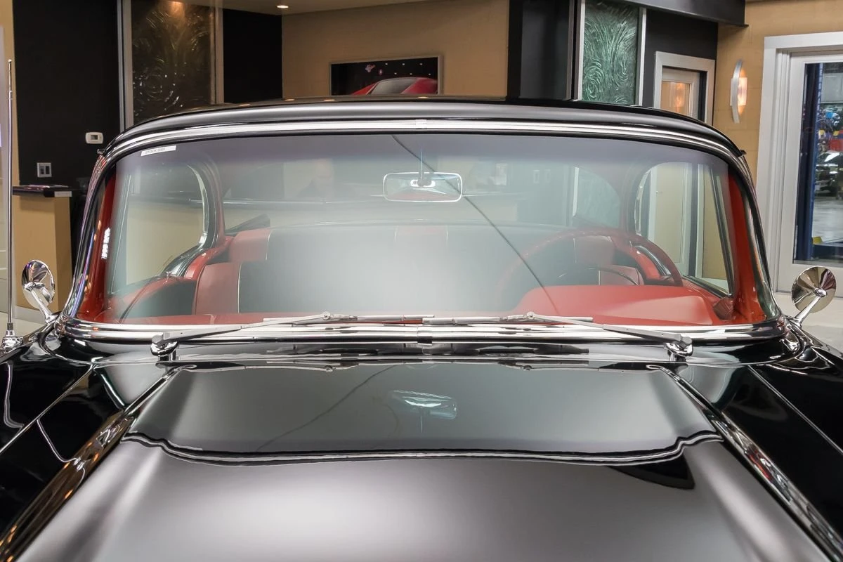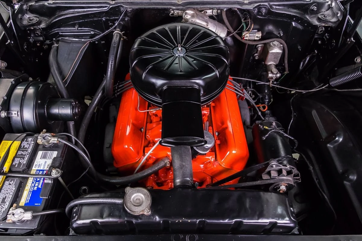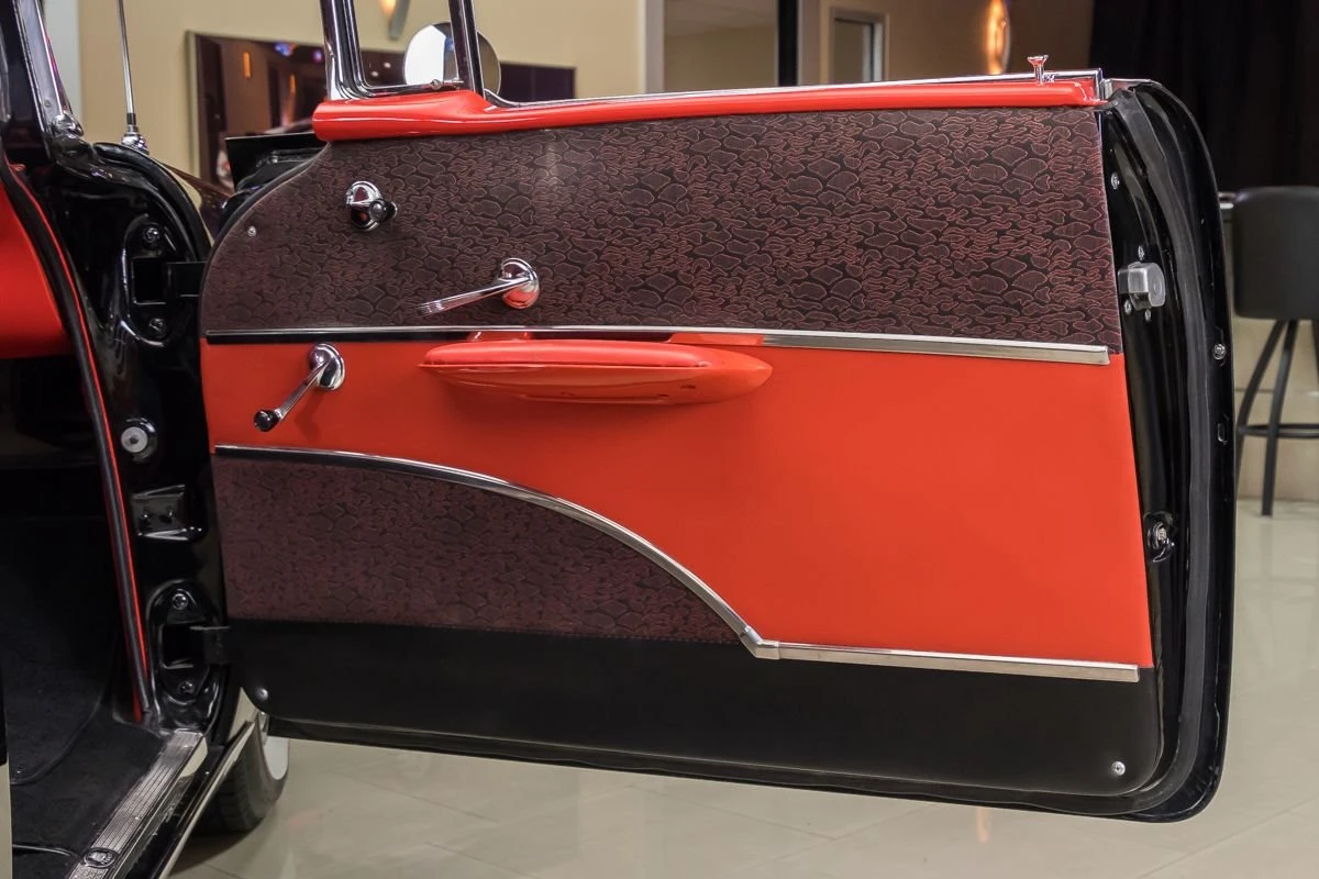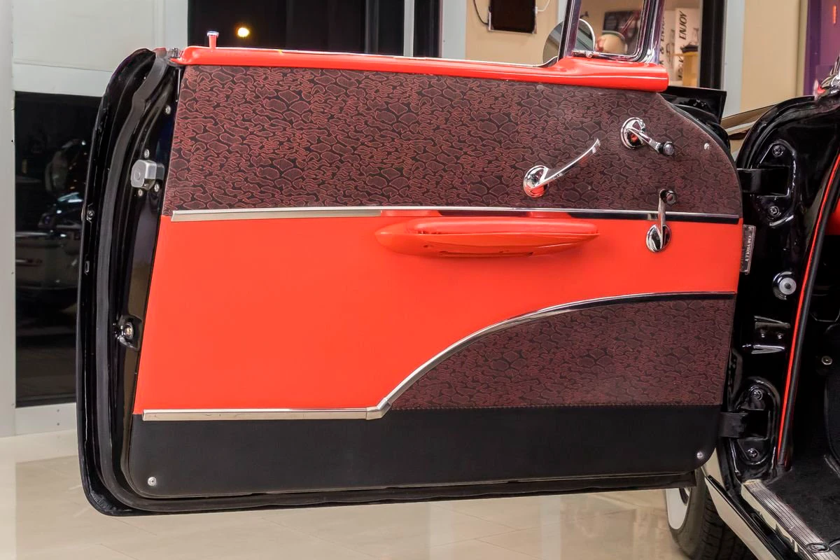 1957 Chevrolet Bel Air Hardtop in Onyx Black over Two-Tone Interior. Power comes from a 327ci V8 engine paired with a 3-speed Saginaw manual transmission, commonly known as “three-on-the-tree.” The car has undergone a complete restoration, featuring straight body lines, mirror-finish chrome, and excellent stainless trim throughout. Dual exhaust with FlowMaster mufflers adds a deep tone, while the undercarriage presents solid floors, new shocks, and a clean frame.