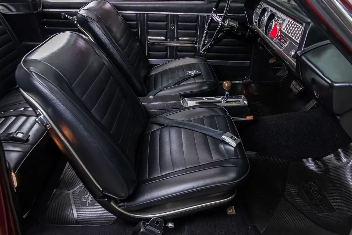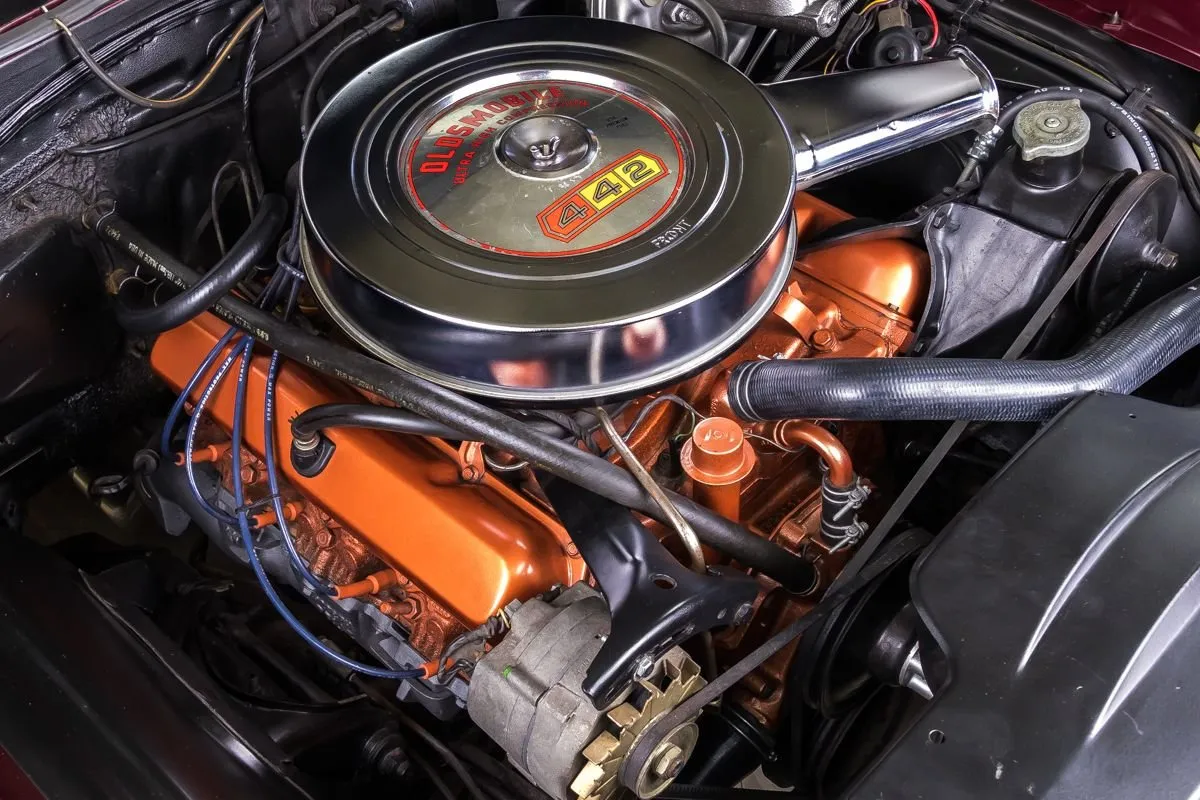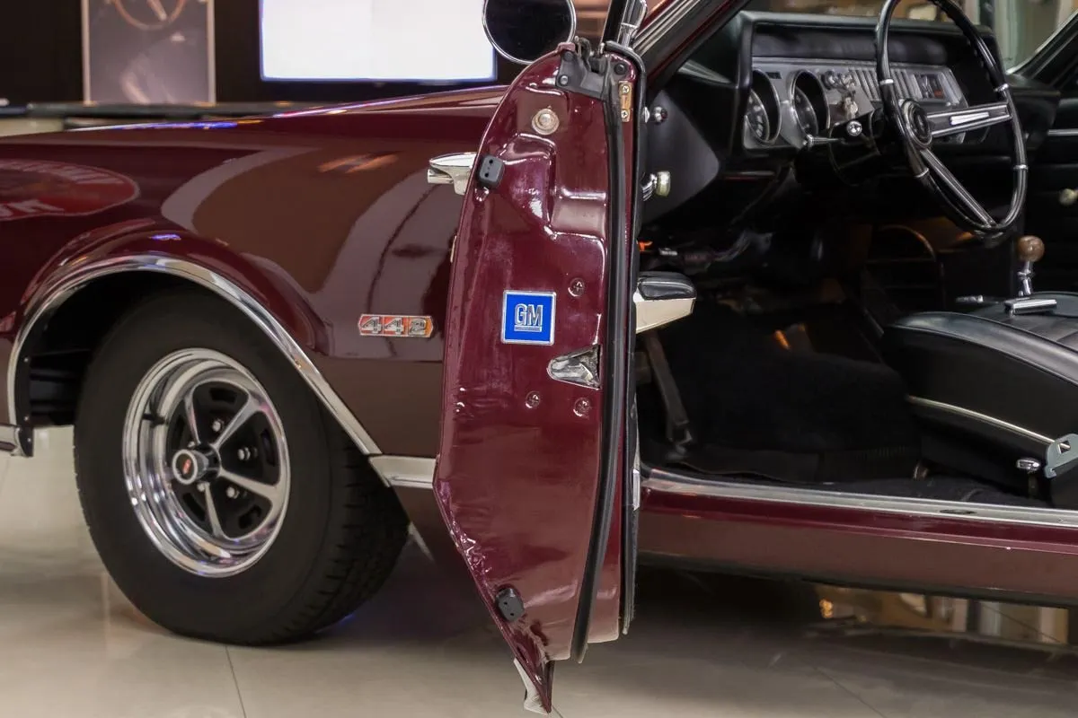 1967 Oldsmobile 442 Convertible in Burgundy Mist over Black Bucket Seat Interior. This fully restored and numbers-matching 442 is powered by its original 400ci V8 engine, paired with a TH400 3-speed automatic transmission and a 10-bolt posi-traction rear end with 3.07:1 gears. The factory-correct Quadrajet carburetor, power steering, and power brakes offer both performance and drivability.