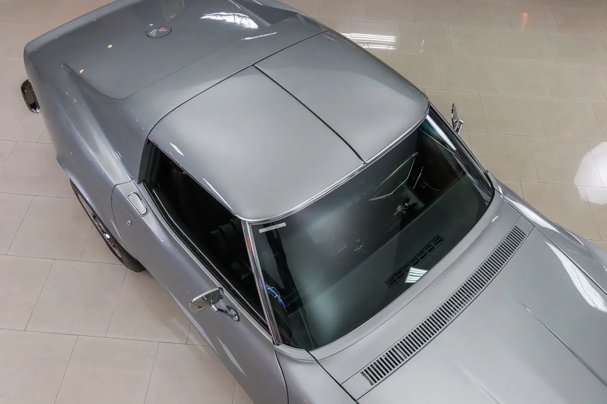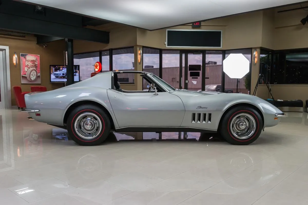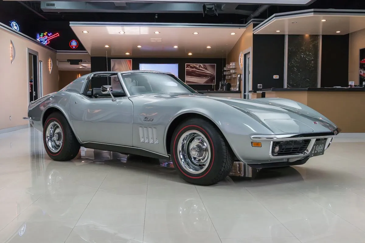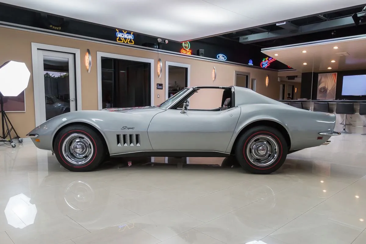 1969 Chevrolet Corvette T-Top Coupe in Cortez Silver over Black Interior. This classic Corvette features a numbers-matching L46 350ci V8 producing 350 horsepower, paired with its original Muncie M20 4-speed manual transmission. With just 81,000 original miles and one long-term owner for 36 years, it underwent a full frame-off restoration in 2002 and has been sparingly driven since.