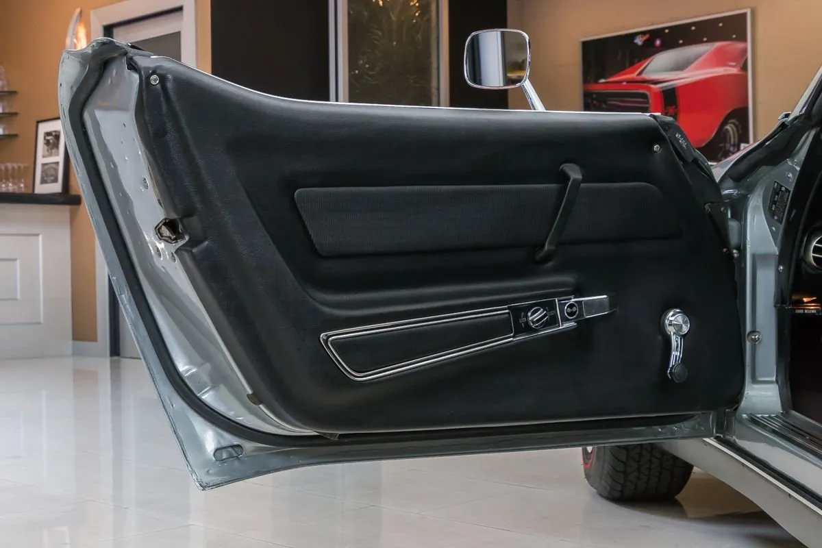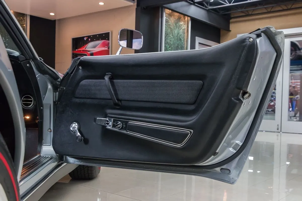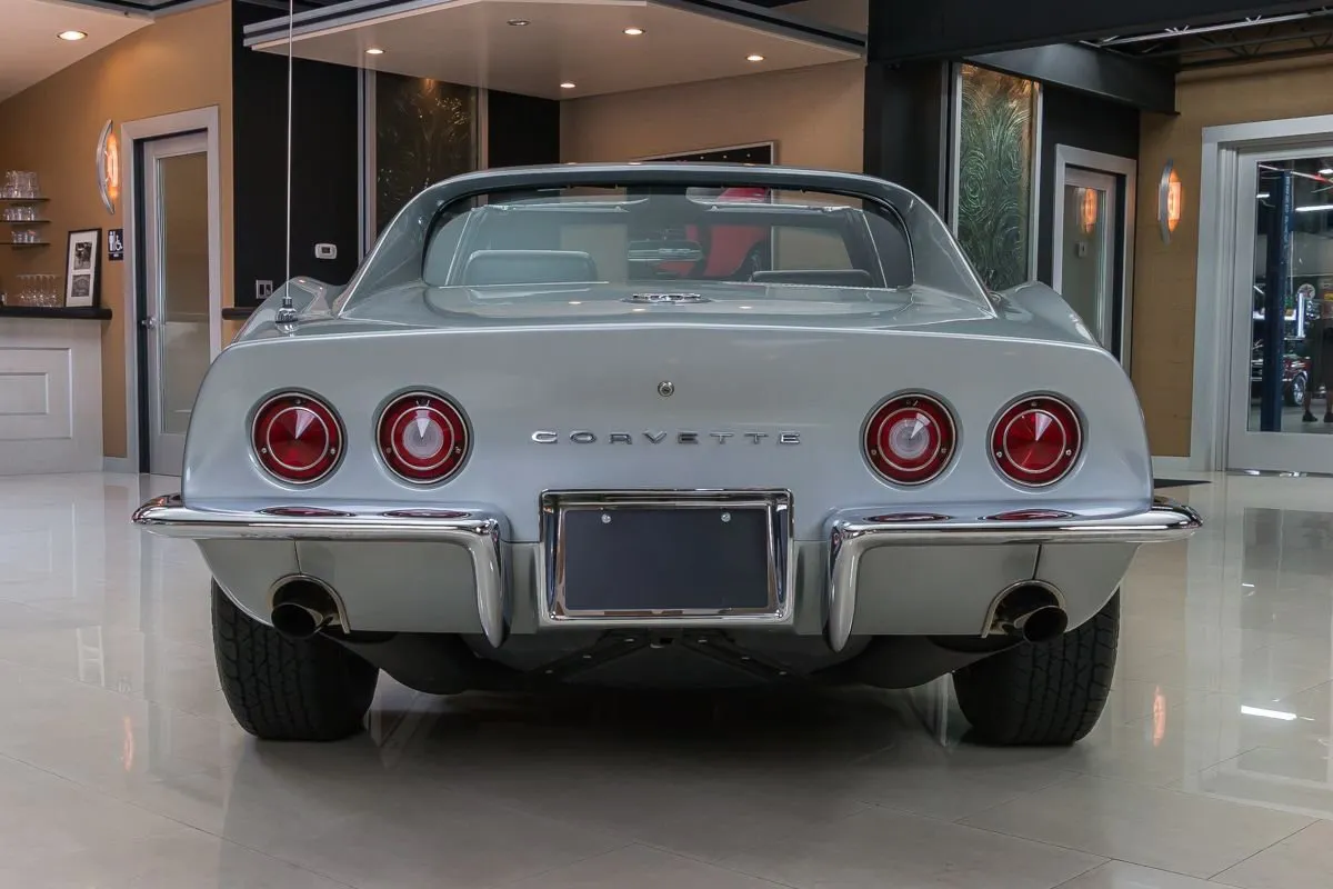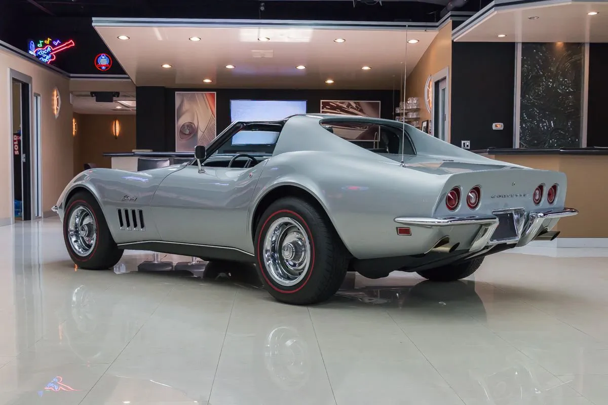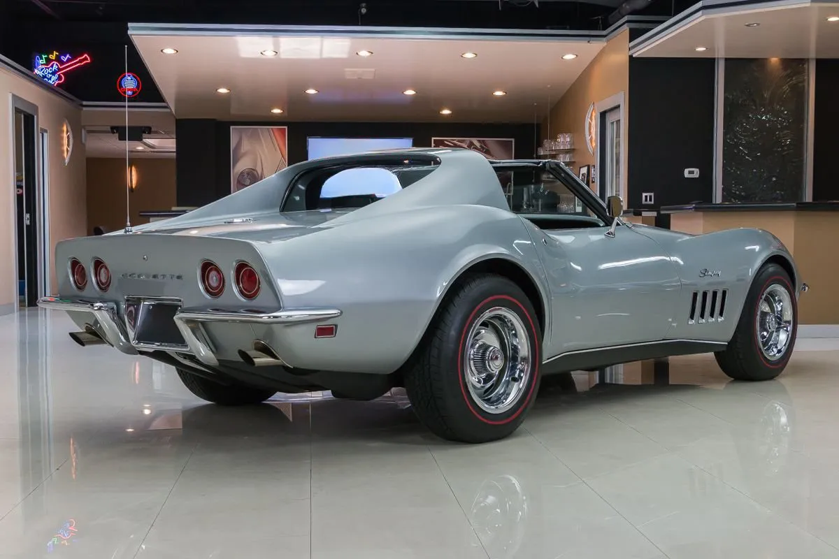 1969 Chevrolet Corvette T-Top Coupe in Cortez Silver over Black Interior. This classic Corvette features a numbers-matching L46 350ci V8 producing 350 horsepower, paired with its original Muncie M20 4-speed manual transmission. With just 81,000 original miles and one long-term owner for 36 years, it underwent a full frame-off restoration in 2002 and has been sparingly driven since.
