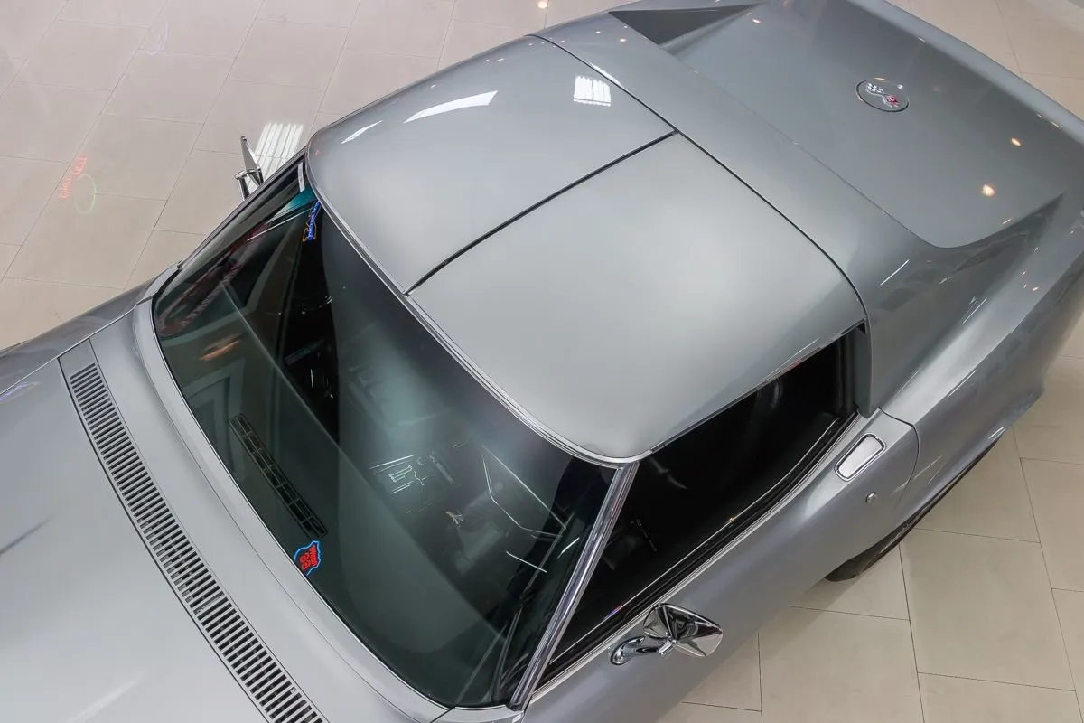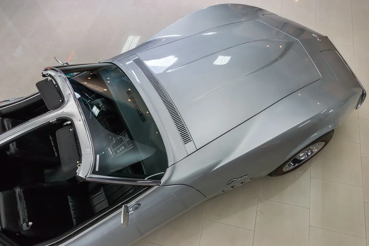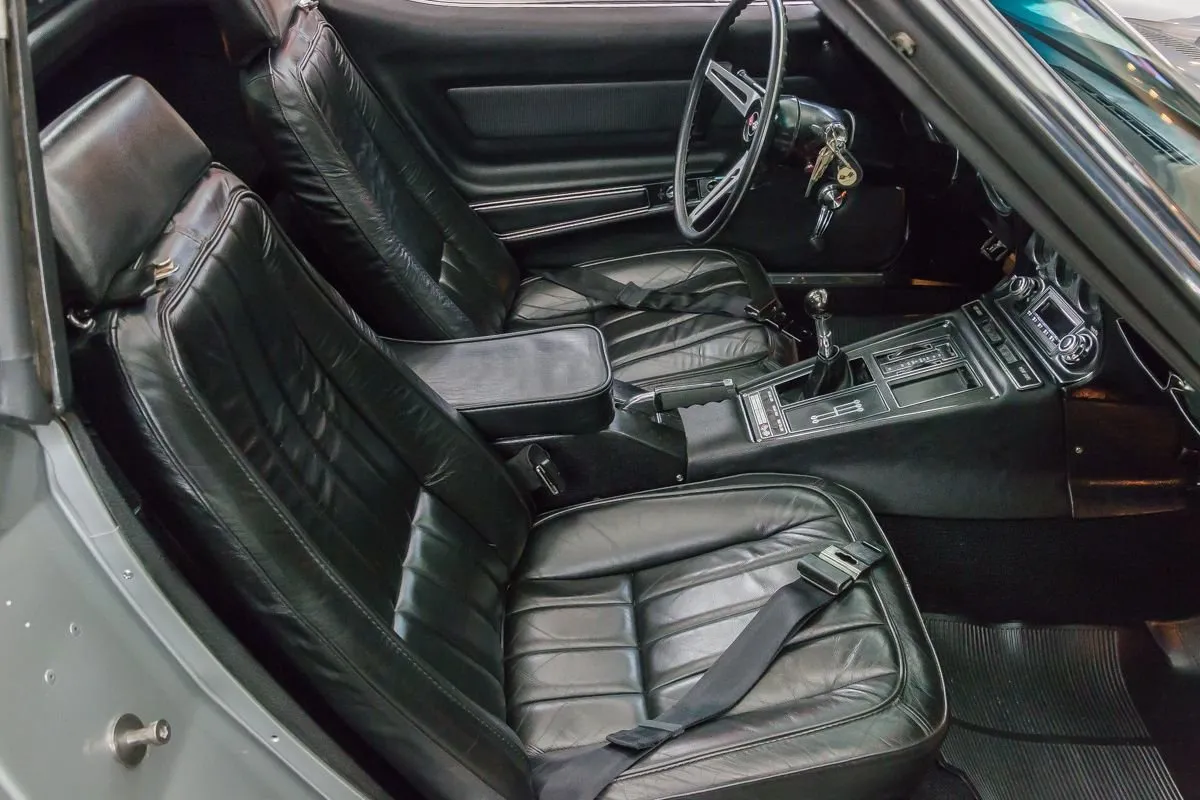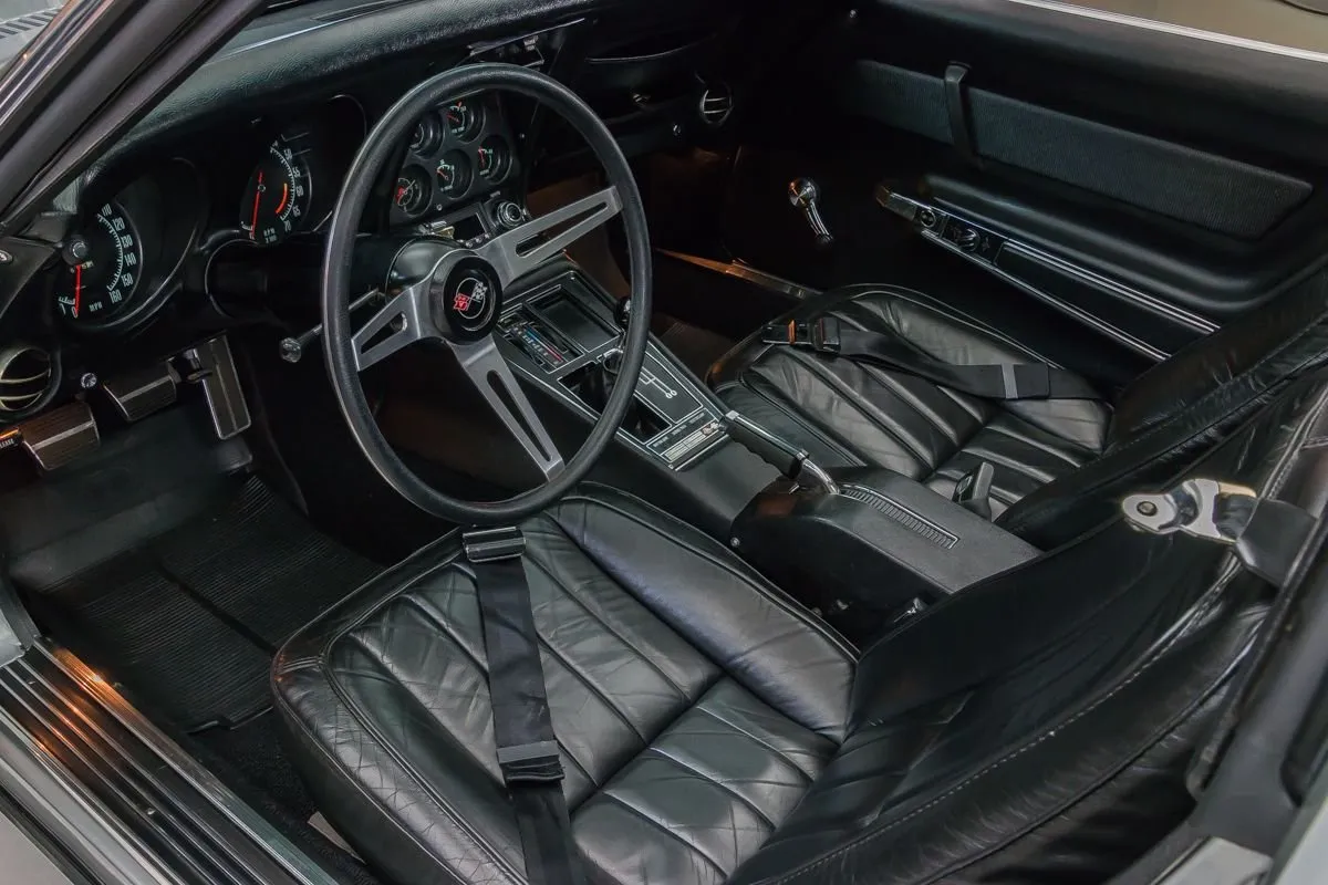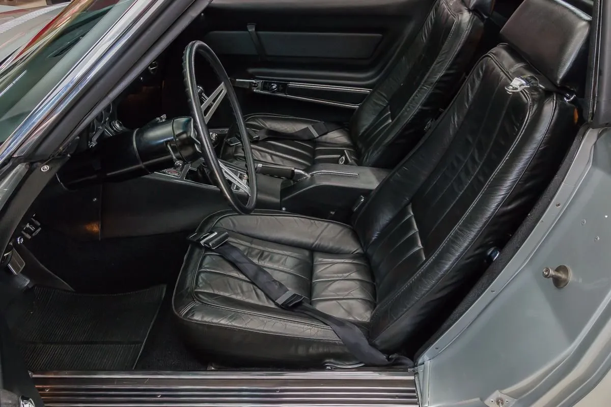 The Cortez Silver paint is smooth and glossy, accented by T-tops, clean chrome bumpers, and redline Silvertown tires on 15” Corvette wheels. The undercarriage remains clean and original with no repairs made to the floorboards.