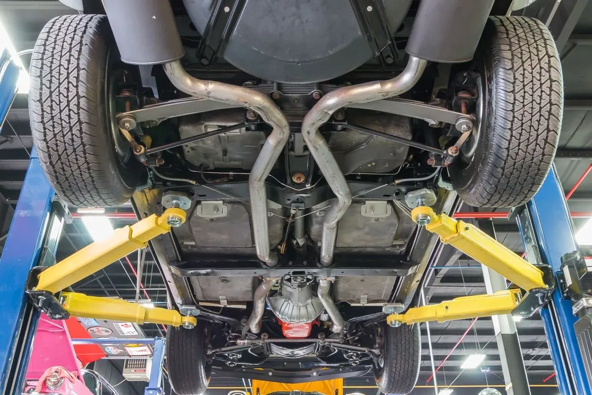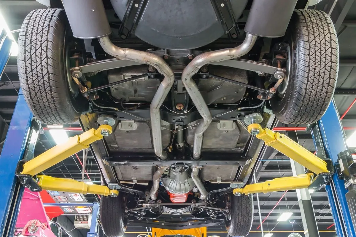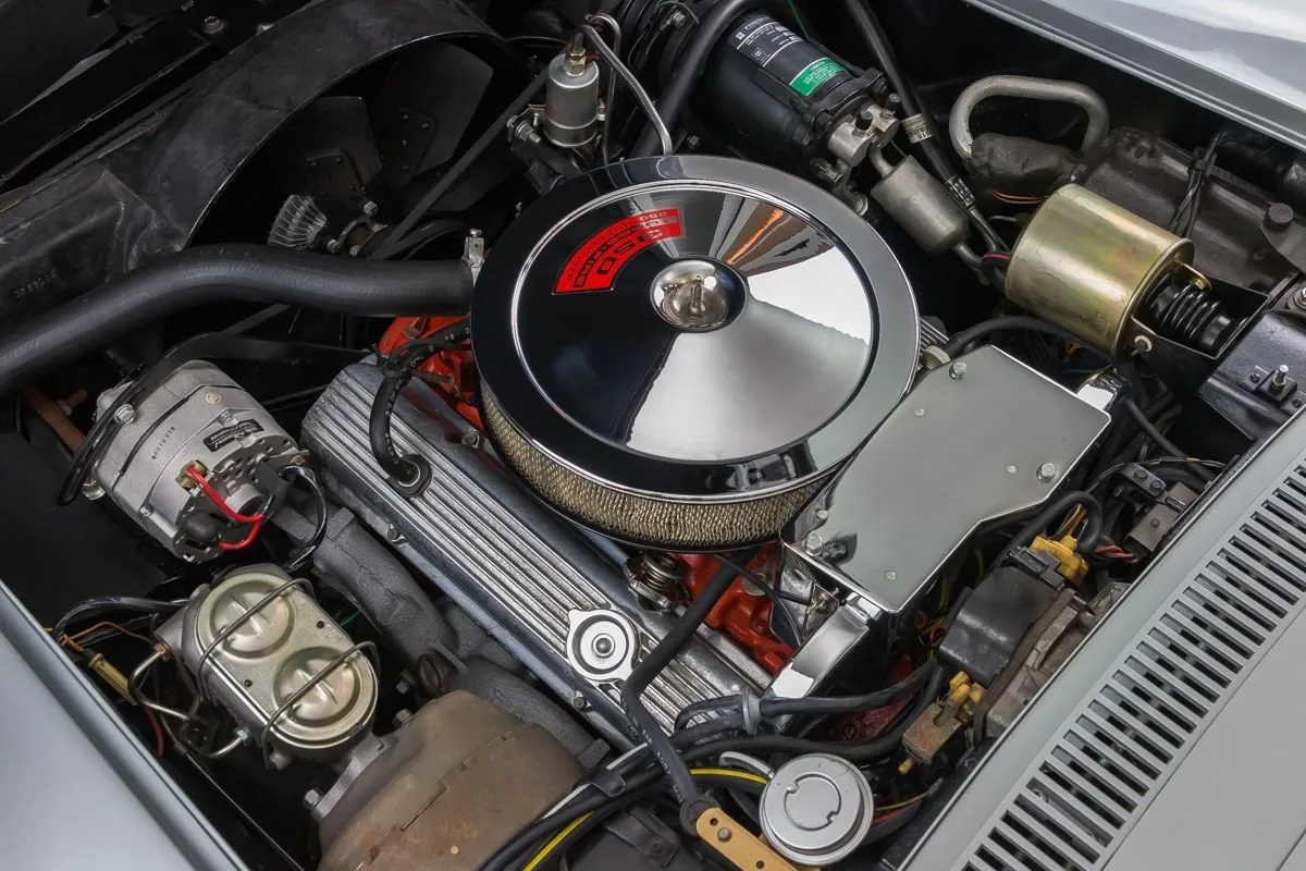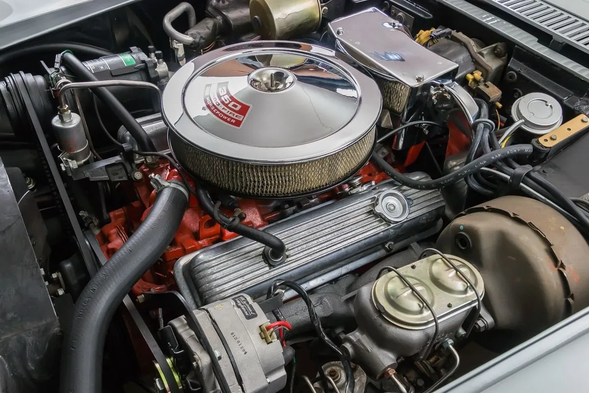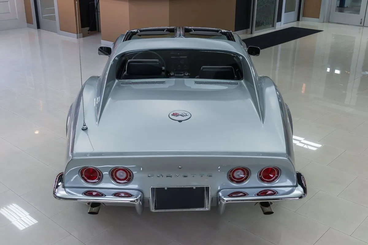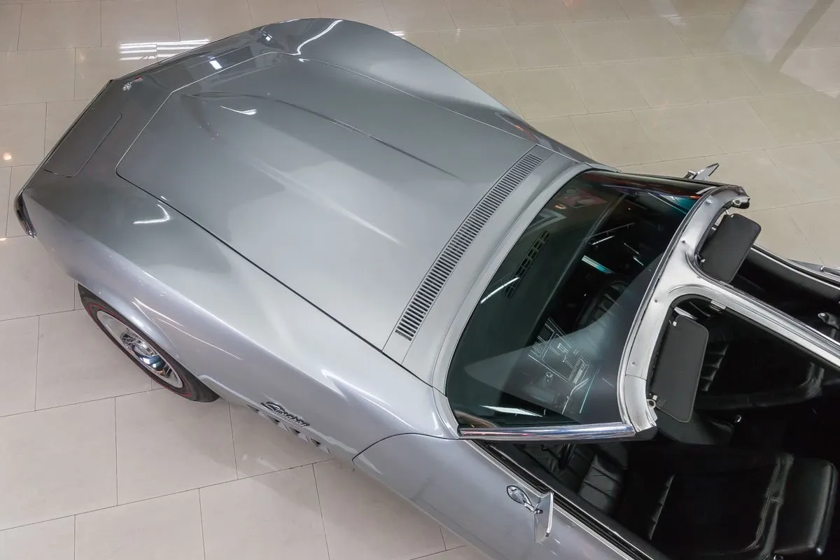 The Cortez Silver paint is smooth and glossy, accented by T-tops, clean chrome bumpers, and redline Silvertown tires on 15” Corvette wheels. The undercarriage remains clean and original with no repairs made to the floorboards.