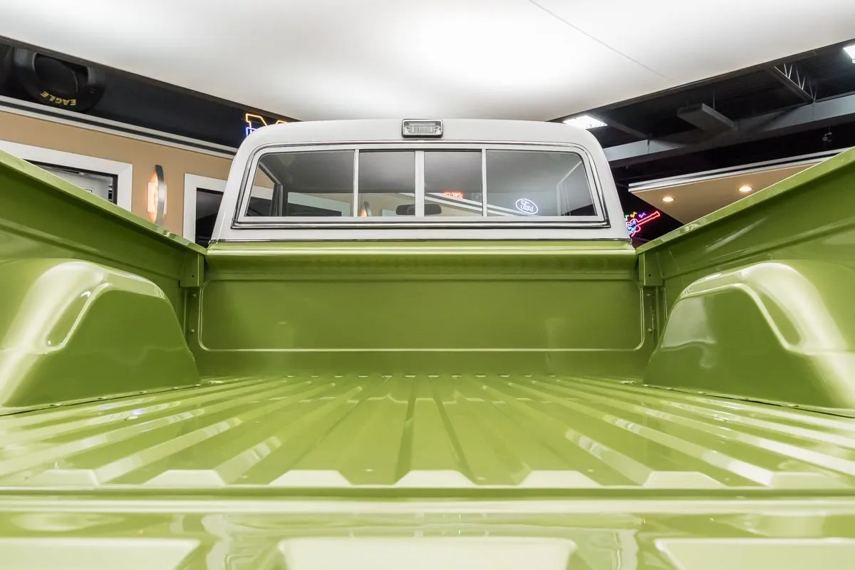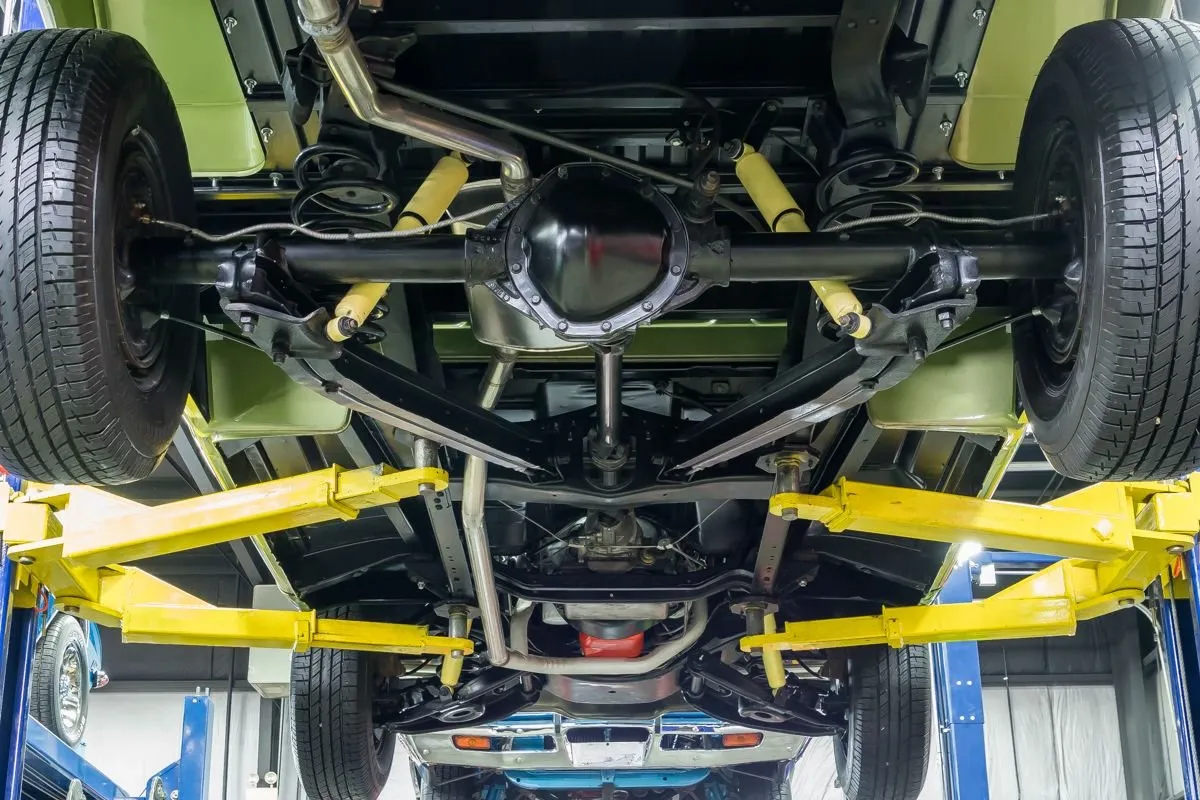 The undercarriage is highly detailed with painted frame, new lines, tight cross members, fresh bushings, and solid cab corners. Suspension and springs present as new, while the truck rides on 15” wheels wrapped in Uniroyal Laredo 235/70R15 tires. Braking is handled by front power discs and rear drums.
