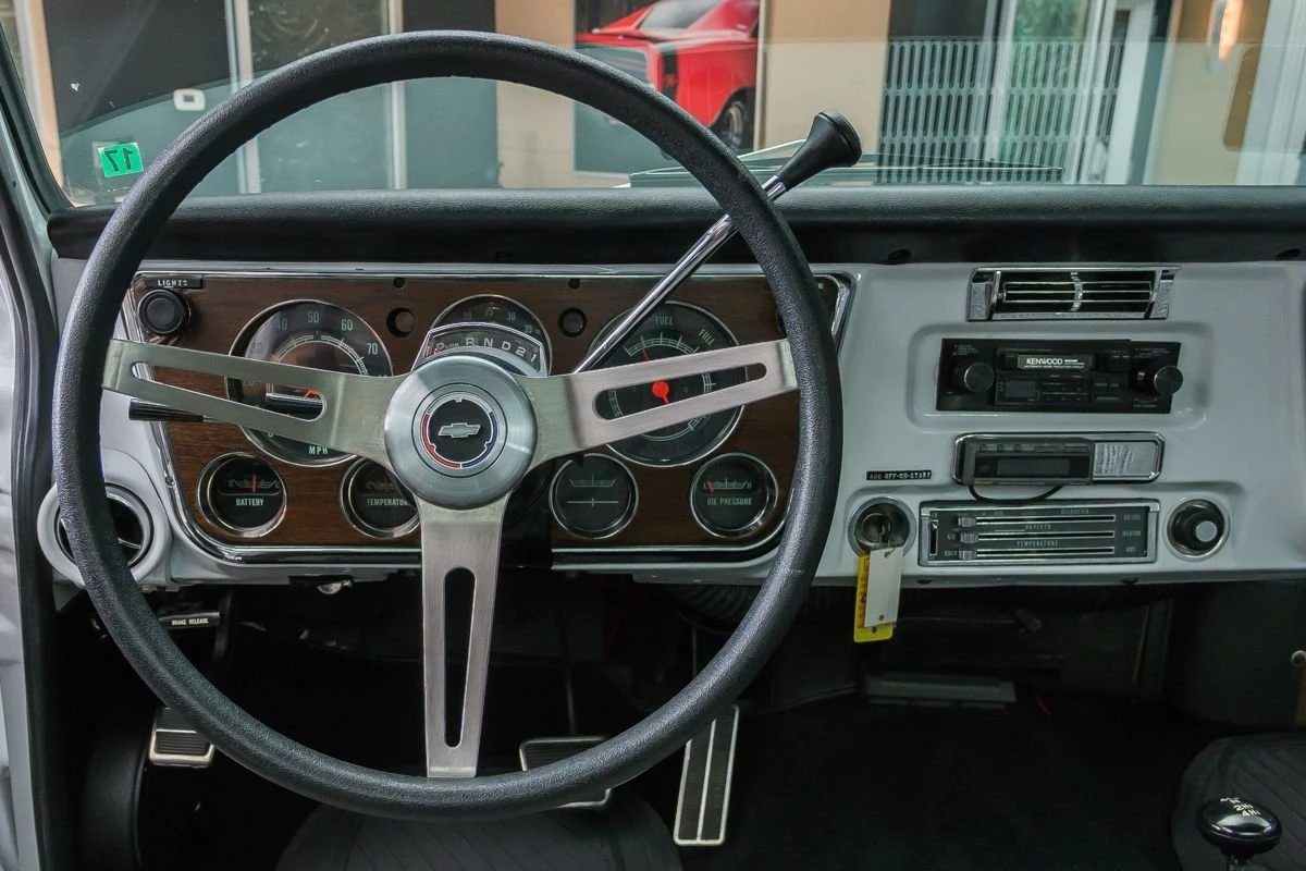 This C10 underwent a full frame-off restoration in 2015 and is powered by a new GM 350ci crate V8 with Edelbrock 4-barrel carburetor, RPM Air-Gap intake, polished valve covers, and full-length headers. The engine is paired with a TH700R4 automatic overdrive transmission, a New Process 205 transfer case, and a 12-bolt rear end with 3.73:1 Posi-Trac gearing. Power steering, power brakes, and factory air conditioning provide comfortable drivability, while Flowmaster dual exhaust completes the setup.