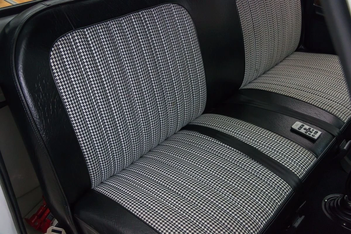 Inside, the cabin is finished with a restored Houndstooth bench seat, tilt steering column, black carpeting, and clear, detailed gauges. The dash and trim are painted white with chrome accents, complemented by a vinyl headliner and stock door panels.